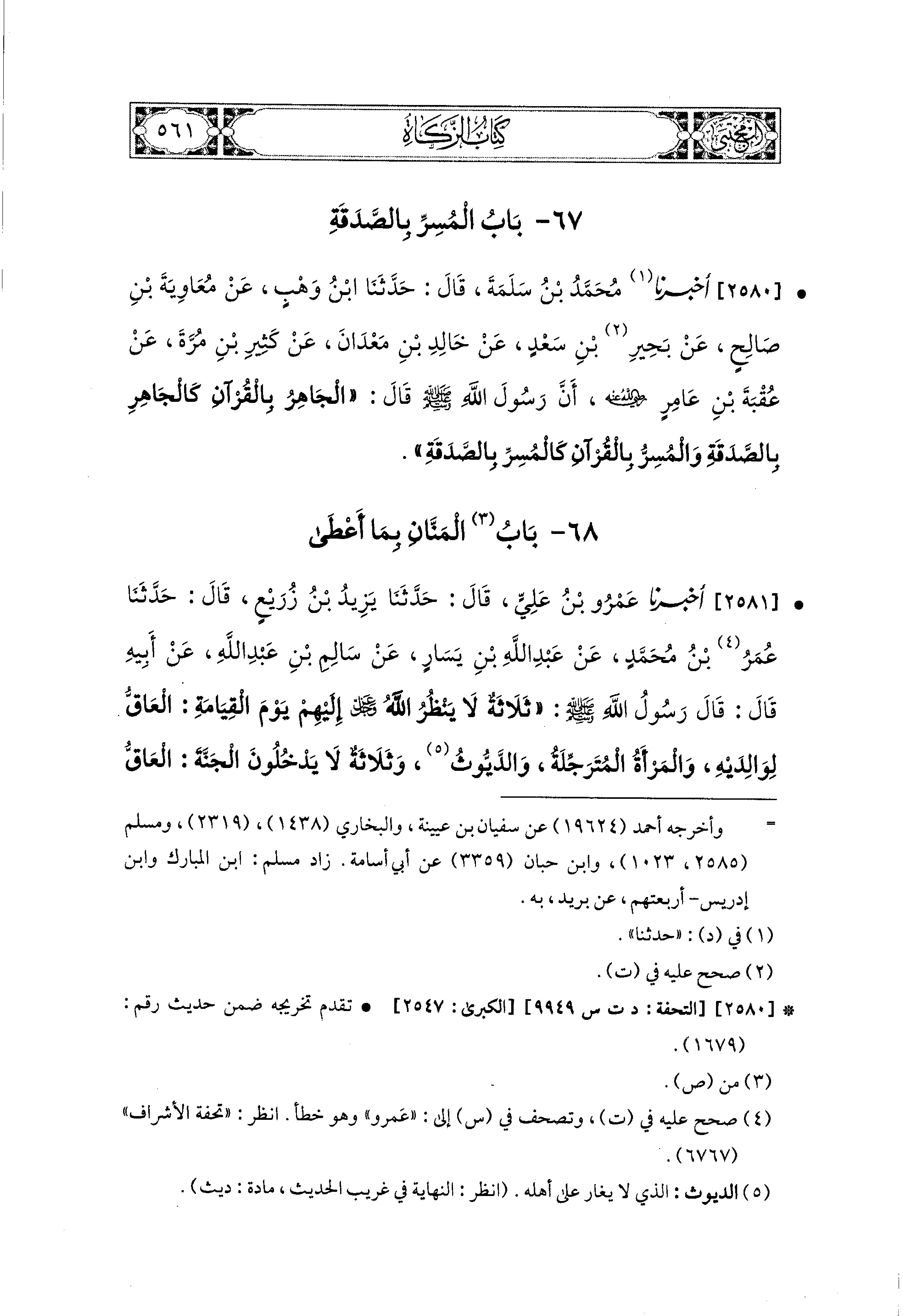 2581- أَخبَرَنا عَمْرُو بْنُ عَلِيٍّ، قال: حَدثنا يَزِيدُ بْنُ زُرَيْعٍ، قال: حَدثنا عُمَرُ بْنُ مُحَمدٍ، عَن عَبد اللهِ بن يَسَارٍ، عَن سَالِمِ بْنِ عَبدِ اللهِ، عَن أَبيهِ، قَالَ: قَالَ رَسُولُ اللهِ صَلى الله عَليه وسَلم: ثَلاَثَةٌ لاَ يَنْظُرُ اللهُ عَزَّ وَجَلَّ إِلَيْهِمْ يَوْمَ القِيَامَةِ: العَاقُّ لِوَالِدَيْهِ، وَالمَرْأَةُ المُتَرَجِّلَةُ، وَالدَّيُّوثُ، وَثَلاَثَةٌ لاَ يَدْخُلُونَ الجَنَّةَ: العَاقُّ لِوَالِدَيْهِ، وَالمُدْمِنُ الخَمْرِ، وَالمَنَّانُ بِمَا أَعْطَى.