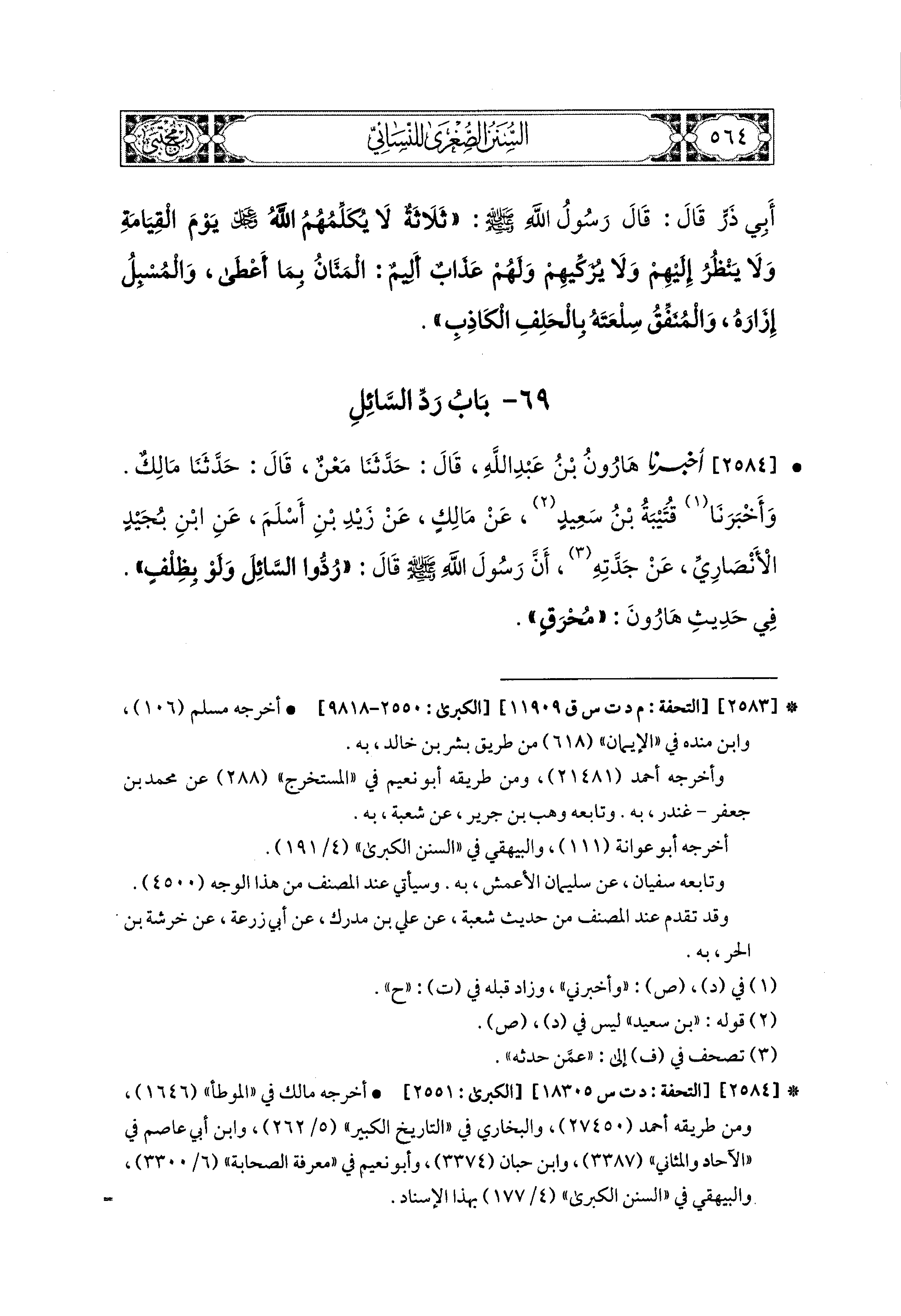 2584- أَخبَرني هَارُونُ بْنُ عَبدِ اللهِ، قال: حَدثنا مَعْنٌ، قال: حَدثنا مَالِكٌ وَأَخبَرنا قُتَيبَةُ بْنُ سَعيدٍ، عَن مَالِكٍ، عَن زَيْدِ بْنِ أَسْلَمَ، عَنِ ابنِ بُجَيْدٍ الأَنصَارِيِّ، عَن جَدِّتِهِ، أَنَّ رَسُولَ اللهِ صَلى الله عَليه وسَلم قَالَ: رُدُّوا السَّائِلَ وَلَوْ بِظِلْفٍ، فِي حَدِيثِ هَارُونَ، مُحْرَقٍ.