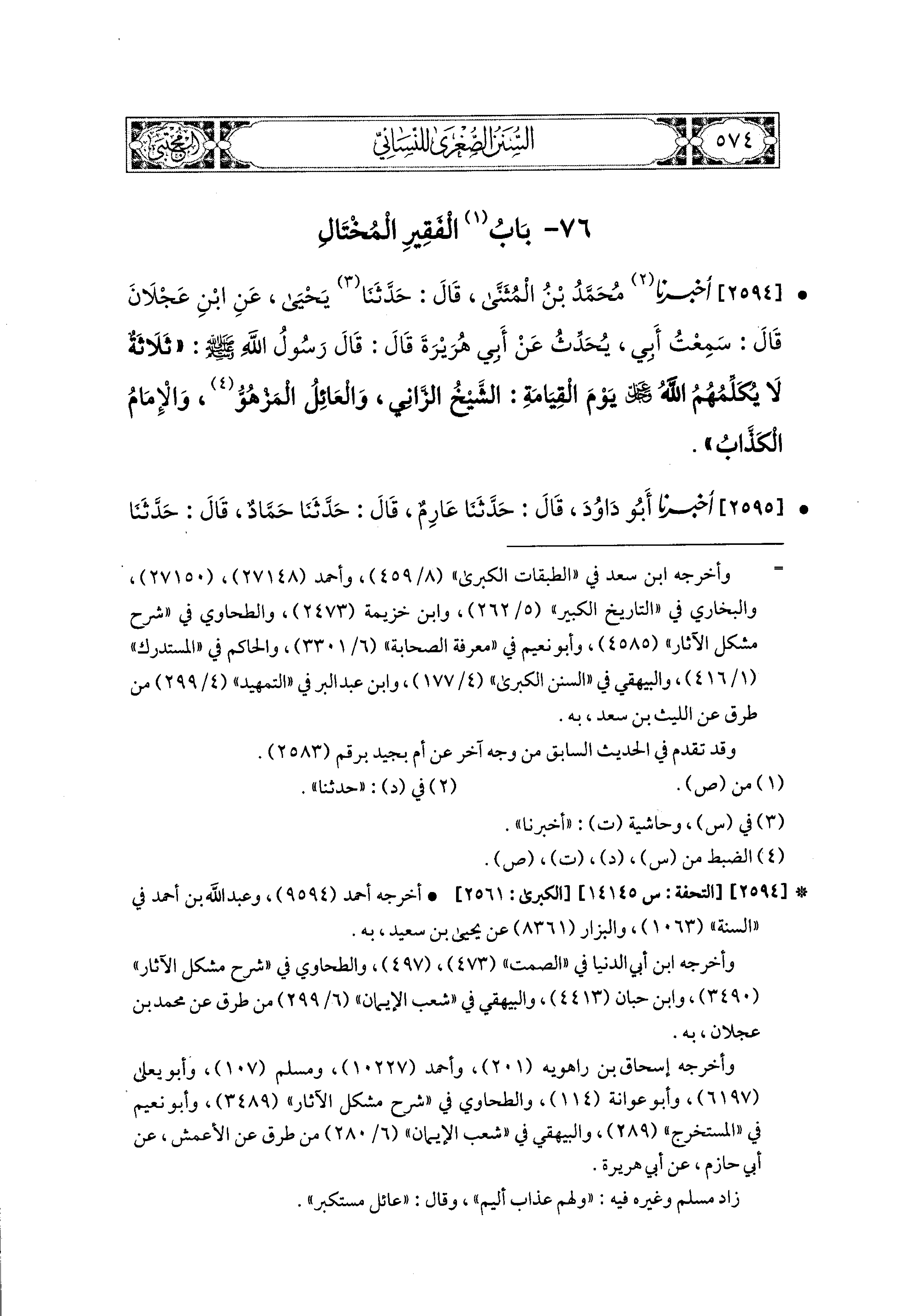 2594- أَخبَرَنا مُحَمد بْنُ المُثَنَّى، قال: حَدثنا يَحيَى، عَنِ ابنِ عَجْلاَنَ، قَالَ: سَمِعْتُ أَبي يُحَدِّثُ، عَن أَبي هُرَيرَةَ، قَالَ: قَالَ رَسُولُ اللهِ صَلى الله عَليه وسَلم: ثَلاَثَةٌ لاَ يُكَلِّمُهُمُ اللهُ عَزَّ وَجَلَّ يَوْمَ القِيَامَةِ: الشَّيْخُ الزَّاني، وَالعَائِلُ المَزْهُوُّ، وَالإِمَامُ الكَذَّابُ.