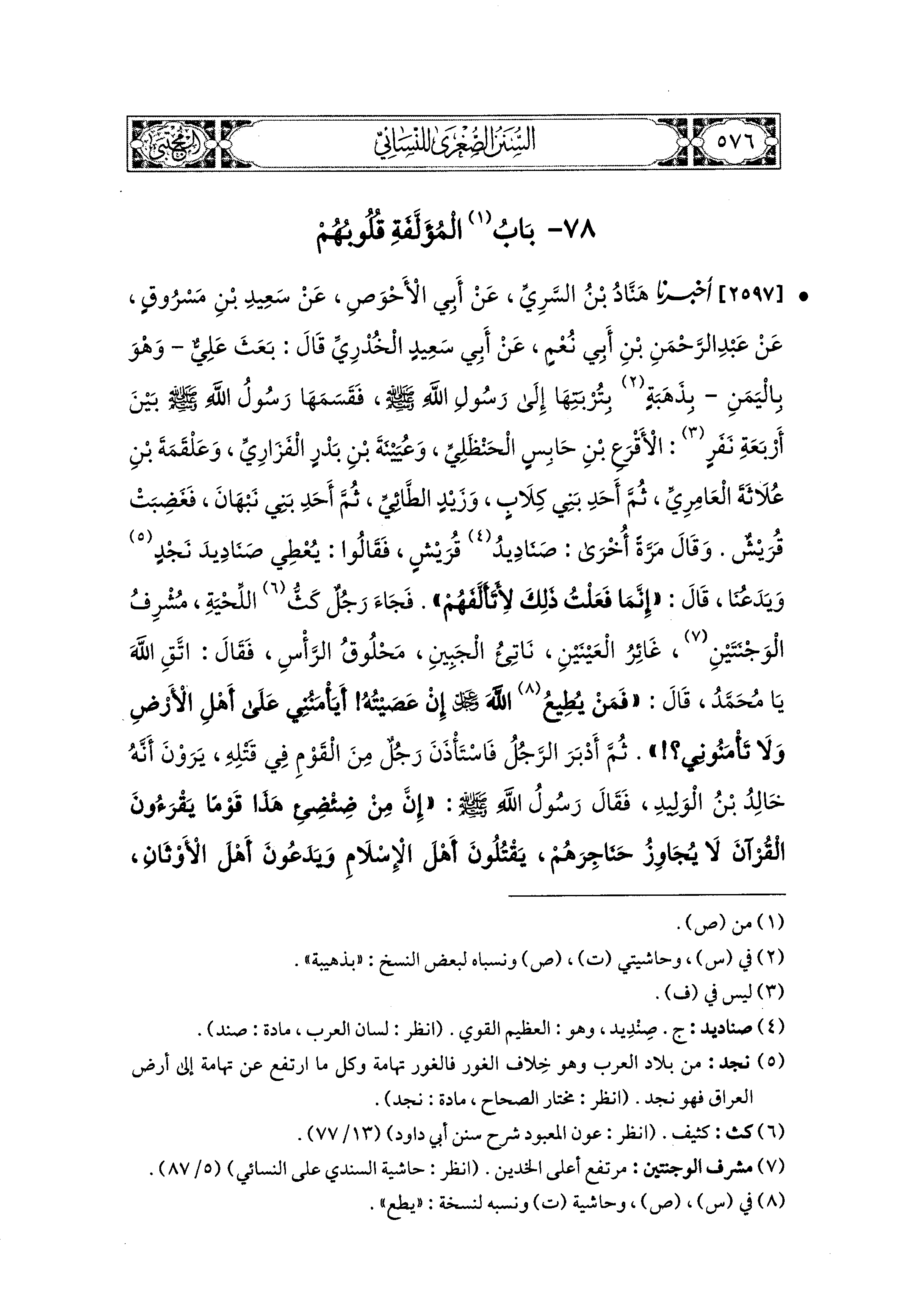 2597- أَخبَرَنا هَنَّادُ بْنُ السَّرِيِّ، عَن أَبي الأَحْوَصِ، عَن سَعيدِ بْنِ مَسْرُوقٍ، عَن عَبدِ الرَّحمَنِ بْنِ أَبي نُعْمٍ، عَن أَبي سَعيدٍ الخُدْرِيِّ، قَالَ: بَعَثَ عَلِيٌّ وَهُوَ بِاليَمَنِ بِذُهَبَةٍ بِتُرْبَتِهَا إِلَى رَسُولِ اللهِ صَلى الله عَليه وسَلم، فَقَسَمَهَا رَسُولُ اللهِ صَلى الله عَليه وسَلم، بَيْنَ أَرْبَعَةِ نَفَرٍ: الأَقْرَعِ بْنِ حَابِسٍ الحَنْظَلِيِّ، وَعُيَيْنَةَ بْنِ بَدْرٍ الفَزَارِيِّ، وَعَلْقَمَةَ بْنِ عُلاَثَةَ العَامِرِيِّ، ثُمَّ أَحَدِ بَني كِلاَبٍ، وَزَيْدٍ الطَّائِيِّ ثُمَّ أَحَدِ بَني نَبْهَانَ فَغَضِبَتْ قُرَيْشٌ، وَقَالَ مَرَّةً أُخْرَى: صَنَادِيدُ قُرَيْشٍ، فَقَالُوا: يُعْطِي صَنَادِيدَ نَجْدٍ، وَيَدَعُنَا، قَالَ: إِنَّمَا فَعَلْتُ ذَلِكَ لأَتَأَلَّفَهُمْ، فَجَاءَ رَجُلٌ كَثُّ اللِّحْيَةِ، مُشْرِفُ الوَجْنَتَيْنِ، غَائِرُ العَيْنَيْنِ، نَاتِئُ الجَبِينِ، مَحْلُوقُ الرَّأْسِ، فَقَالَ: اتَّقِ اللهَ يَا مُحَمدُ، قَالَ: فَمَنْ يُطِعِ اللهَ عَزَّ وَجَلَّ إِنْ عَصَيْتُهُ أَيَأْمَنُني عَلَى أَهْلِ الأَرضِ وَلاَ تَأْمَنُوني، ثُمَّ أَدْبَرَ الرَّجُلُ فَاسْتَأْذَنَ رَجُلٌ مِنَ القَوْمِ، فِي قَتْلِهِ يَرَوْنَ أَنَّهُ خَالِدُ بْنُ الوَلِيدِ فَقَالَ: رَسُولُ اللهِ صَلى الله عَليه وسَلم: إِنَّ مِنْ ضِئْضِئِ هَذَا قَوْمًا يَقْرَؤُونَ القُرْآنَ لاَ يُجَاوِزُ حَنَاجِرَهُمْ، يَقْتُلُونَ أَهْلَ الإِسْلاَمِ، وَيَدَعُونَ أَهْلَ الأَوْثَانِ، يَمْرُقُونَ مِنَ الإِسْلاَمِ، كَمَا يَمْرُقُ السَّهْمُ مِنَ الرَّميَّةِ لَئِنْ أَدْرَكْتُهُمْ لأَقْتُلَنَّهُمْ قَتْلَ عَادٍ.