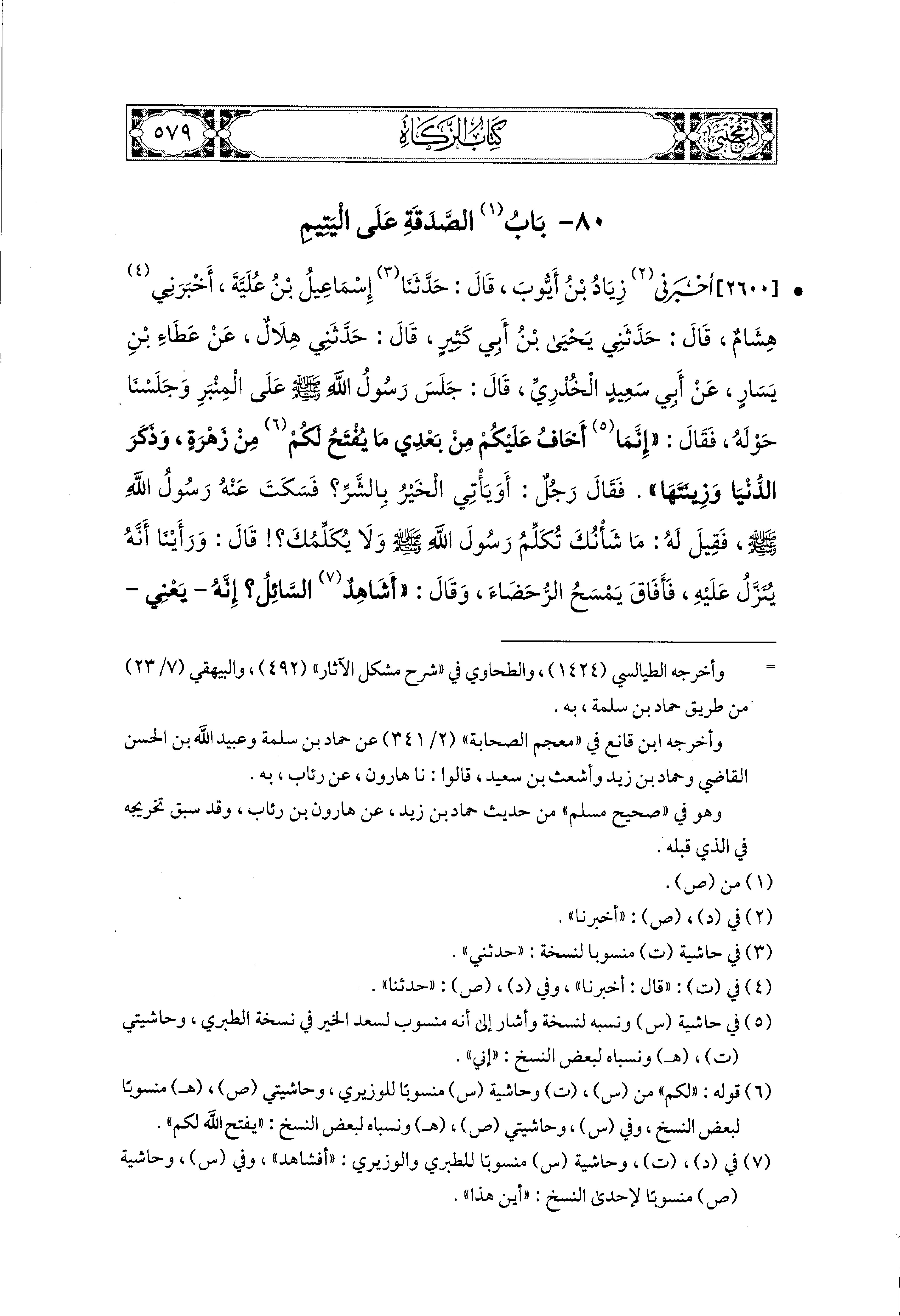2600- أَخبَرني زِيَادُ بْنُ أَيُّوبَ، قال: حَدثنا إِسماعِيلُ ابنُ عُلَيَّةَ، أَخبَرني هِشَامٌ، قَالَ: حَدَّثَني يَحيَى بْنُ أَبي كَثِيرٍ، قَالَ: حَدَّثَني هِلاَلٌ، عَن عَطَاءِ بْنِ يَسَارٍ، عَن أَبي سَعيدٍ الخُدْرِيِّ، قَالَ: جَلَسَ رَسُولُ اللهِ صَلى الله عَليه وسَلم عَلَى المِنْبَرِ، وَجَلَسْنَا حَوْلَهُ، فَقَالَ: إِنَّمَا أَخَافُ عَلَيْكُمْ مِنْ بَعْدِي، مَا يُفْتَحُ لَكُمْ مِنْ زَهْرَةٍ، وَذَكَرَ الدُّنْيَا، وَزِينَتَهَا، فَقَالَ رَجُلٌ: أَوَ يَأْتِي الخَيْرُ بِالشَّرِّ؟ فَسَكَتَ عَنهُ رَسُولُ اللهِ صَلى الله عَليه وسَلم، فَقِيلَ لَهُ: مَا شَأْنُكَ؟ تُكَلِّمُ رَسُولَ اللهِ صَلى الله عَليه وسَلم وَلاَ يُكَلِّمُكَ؟ قَالَ: وَرَأَيْنَا أَنَّهُ يُنْزَلُ عَلَيهِ فَأَفَاقَ يَمْسَحُ الرُّحَضَاءَ، وَقَالَ: أُشَاهِدُ السَّائِلُ إِنَّهُ يعني لاَ يَأْتِي الخَيْرُ بِالشَّرِّ وَإِنَّ مِمَّا يُنْبِتُ الرَّبِيعُ يَقْتُلُ، أَوْ يُلِمُّ إِلاَّ آكِلَةُ الخَضِرِ، فَإِنَّهَا أَكَلَتْ حَتَّى إِذَا امْتَلأت خَاصِرَتَاهَا، اسْتَقْبَلْتَ عَيْنَ الشَّمْسِ فَثَلَطَتْ ثُمَّ بَالَتْ ثُمَّ رَتَعَتْ، وَإِنَّ هَذَا المَالَ خَضِرَةٌ حُلْوَةٌ، وَنِعْمَ صَاحِبُ المُسْلِمِ، هُوَ إِنْ أَعْطَى مِنْهُ اليَتِيمَ، وَالمِسكينَ، وَابنَ السَّبِيلِ، وَإِنَّ الَّذِي يَأْخُذُهُ بِغَيْرِ حَقِّهِ، كَالَّذِي يَأْكُلُ وَلاَ يَشْبَعُ، وَيَكُونُ عَلَيهِ شَهِيدًا يَوْمَ القِيَامَةِ.