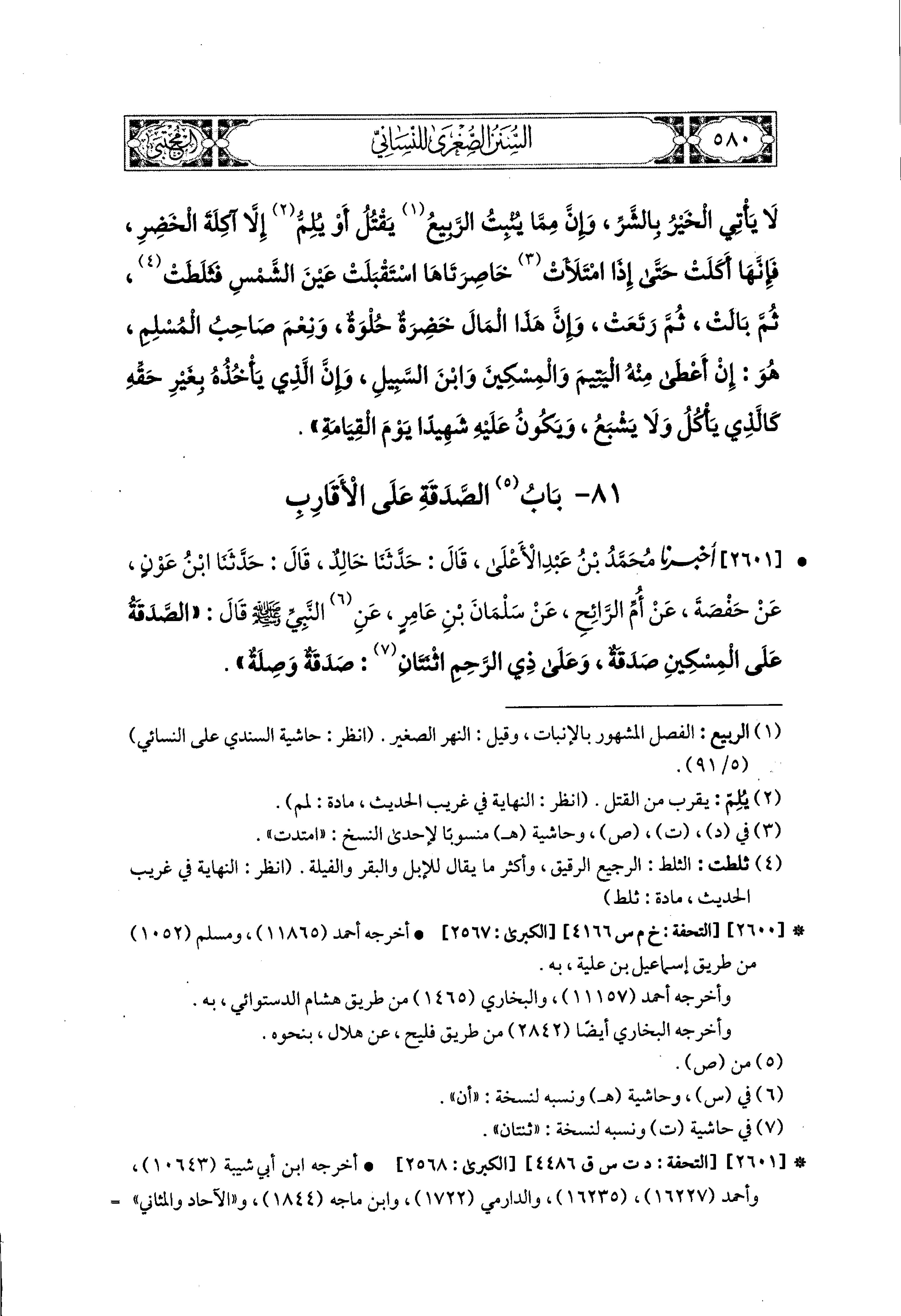 2601- أَخبَرَنا مُحَمد بْنُ عَبدِ الأَعَلَى، قال: حَدثنا خَالِدٌ، قال: حَدثنا ابنُ عَوْنٍ، عَن حَفْصَةَ، عَن أُمِّ الرَّائِحِ، عَن سَلْمَانَ بْنِ عَامِرٍ، عَنِ النَّبيِّ صَلى الله عَليه وسَلم قَالَ: الصَّدَقَةَ عَلَى المِسكينِ صَدَقَةٌ، وَعَلَى ذِي الرَّحِمِ اثْنَتَانِ صَدَقَةٌ وَصِلَةٌ.