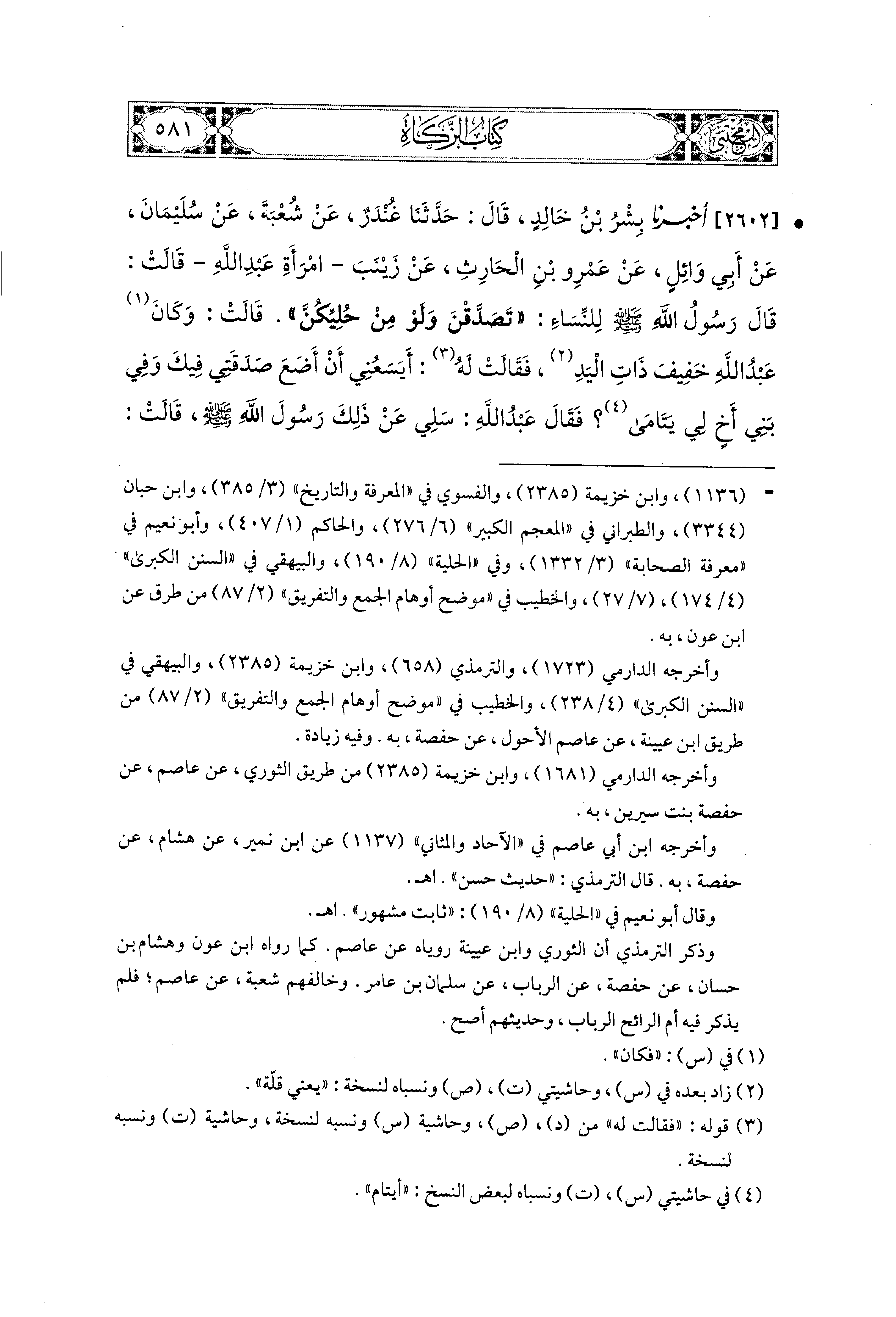 2602- أَخبَرَنا بِشْرُ بْنُ خَالِدٍ، قال: حَدثنا غُنْدَرٌ، عَن شُعبَةَ، عَن سُلَيمَانَ، عَن أَبي وَائِلٍ، عَن عَمْرِو بْنِ الحَارِثِ، عَن زَيْنَبَ، امْرَأَةِ عَبدِ اللهِ، قَالَتْ: قَالَ رَسُولُ اللهِ صَلى الله عَليه وسَلم لِلنِّسَاءِ: تَصَدَّقْنَ وَلَوْ مِنْ حُلِيِّكُنَّ، قَالَتْ: وَكَانَ عَبدُ اللهِ خَفِيفَ ذَاتِ اليَدِ، فَقَالَتْ لَهُ: أَيَسَعُني أَنْ أَضَعَ صَدَقَتِي فِيكَ وَفِي بَني أَخٍ لِي يَتَامَى، فَقَالَ عَبدُ اللهِ: سَلِي عَن ذَلِكَ رَسُولَ اللهِ صَلى الله عَليه وسَلم قَالَتْ: فَأَتَيْتُ النَّبيَّ صَلى الله عَليه وسَلم فَإِذَا عَلَى بَابِهِ امْرَأَةٌ مِنَ الأَنصَارِ يُقَالُ لَهَا: زَيْنَبُ تَسْأَلُ عَمَّا أَسْأَلُ عَنهُ، فَخَرَجَ إِلَيْنَا بِلاَلٌ، فَقُلْنَا لَهُ: انْطَلِقْ إِلَى رَسُولِ اللهِ صَلى الله عَليه وسَلم فَسَلْهُ عَن ذَلِكَ، وَلاَ تُخْبِرْهُ مَنْ نَحْنُ، فَانْطَلَقَ إِلَى رَسُولِ اللهِ صَلى الله عَليه وسَلم، فَقَالَ: مَنْ هُمَا؟ قَالَ: زَيْنَبُ، قَالَ: أَيُّ الزَّيَانِبِ؟ قَالَ: زَيْنَبُ امْرَأَةُ عَبدِ اللهِ، وَزَيْنَبُ الأَنصَارِيَّةُ، قَالَ: نَعَمْ، لَهُمَا أَجْرَانِ: أَجْرُ القَرَابَةِ، وَأَجْرُ الصَّدَقَةِ.
