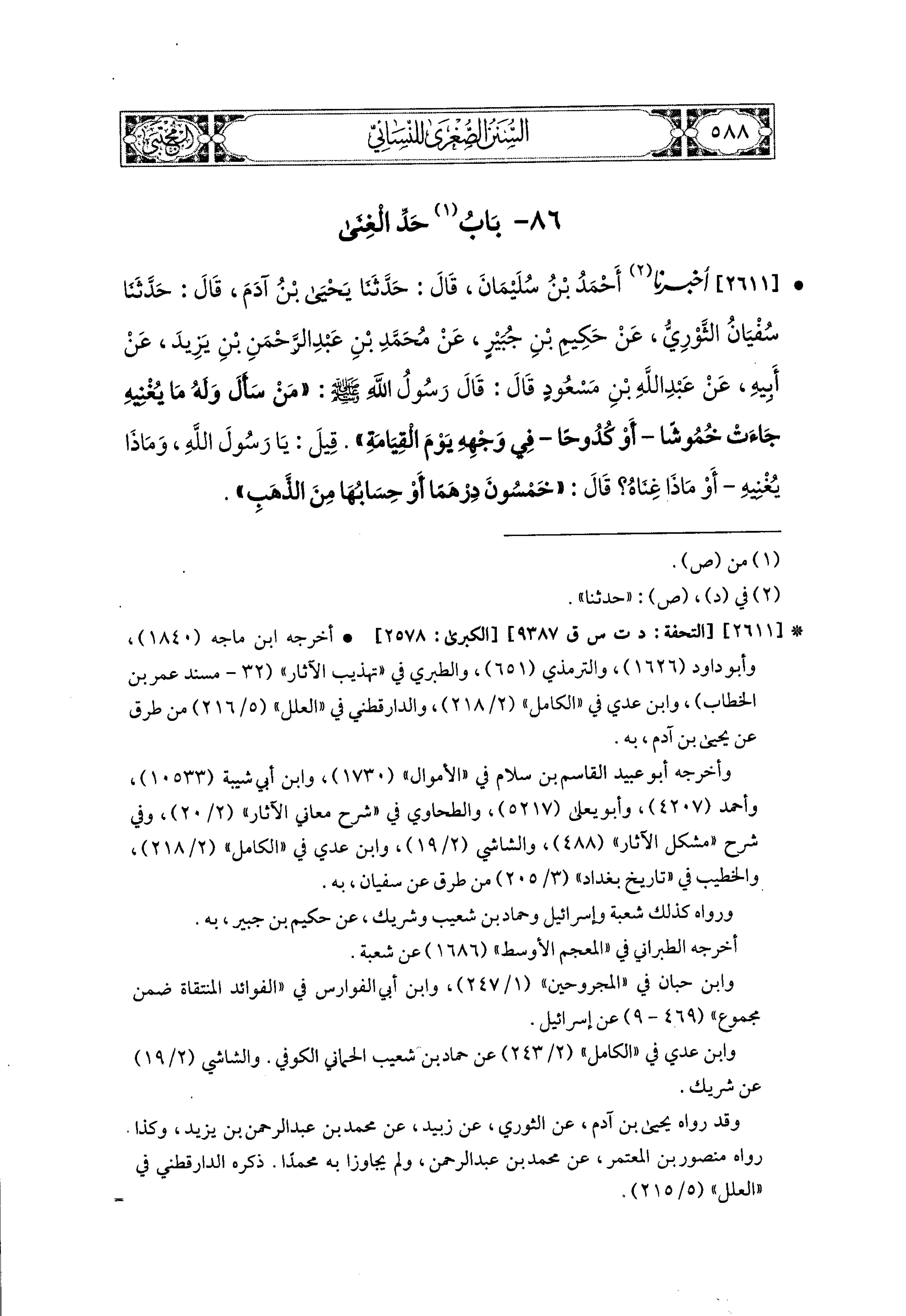 2611- أَخبَرَنا أَحْمَدُ بْنُ سُلَيمَانَ، قال: حَدثنا يَحيَى بْنُ آدَمَ، قال: حَدثنا سُفيَانُ الثَّوْرِيُّ، عَن حَكِيمِ بْنِ جُبَيْرٍ، عَن مُحَمدِ بْنِ عَبدِ الرَّحمَنِ بْنِ يَزِيدَ، عَن أَبيهِ، عَن عَبد اللهِ بن مَسْعُودٍ، قَالَ: قَالَ رَسُولُ اللهِ صَلى الله عَليه وسَلم: مَنْ سَأَلَ وَلَهُ مَا يُغْنيهِ، جَاءَتْ خُمُوشًا، أَوْ كُدُوحًا فِي وَجْهِهِ يَوْمَ القِيَامَةِ، قِيلَ: يَا رَسُولَ اللهِ، وَمَاذَا يُغْنيهِ، أَوْ مَاذَا غْنَاهُ؟ قَالَ: خَمْسُونَ دِرْهَمًا، أَوْ حِسَابُهَا مِنَ الذَّهَبِ.
