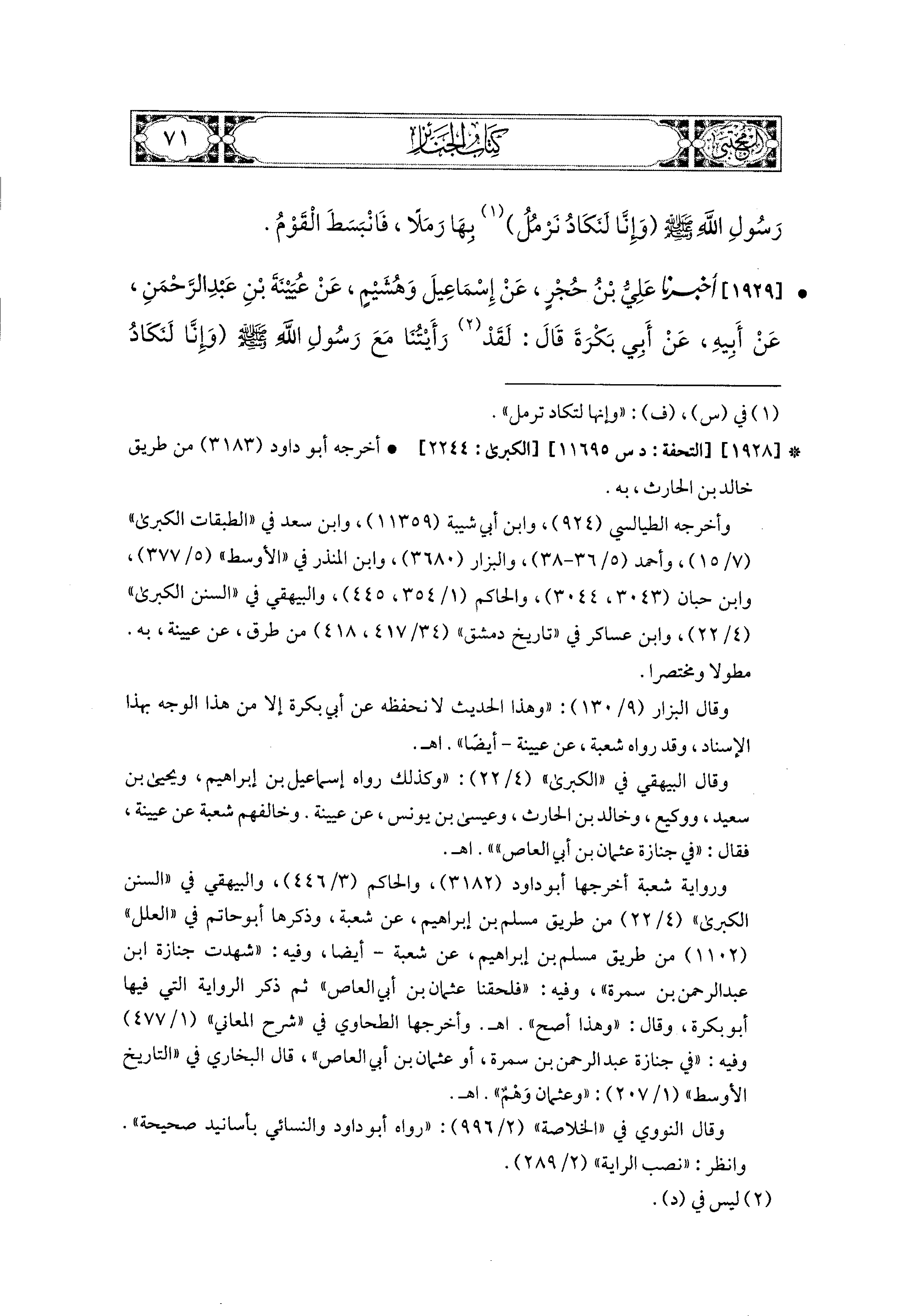 1929- أَخبَرَنا عَلِيُّ بْنُ حُجْرٍ، عَن إِسماعِيلَ، وَهُشَيْمٌ، عَن عُيَيْنَةَ بْنِ عَبدِ الرَّحمَنِ، عَن أَبيهِ، عَن أَبي بَكْرَةَ قَالَ: لَقَدْ رَأَيْتُنَا مَعَ رَسُولِ اللهِ صَلى الله عَليه وسَلم وَإِنَّا لَنَكَادُ نَرْمُلُ بِهَا رَمَلاً.