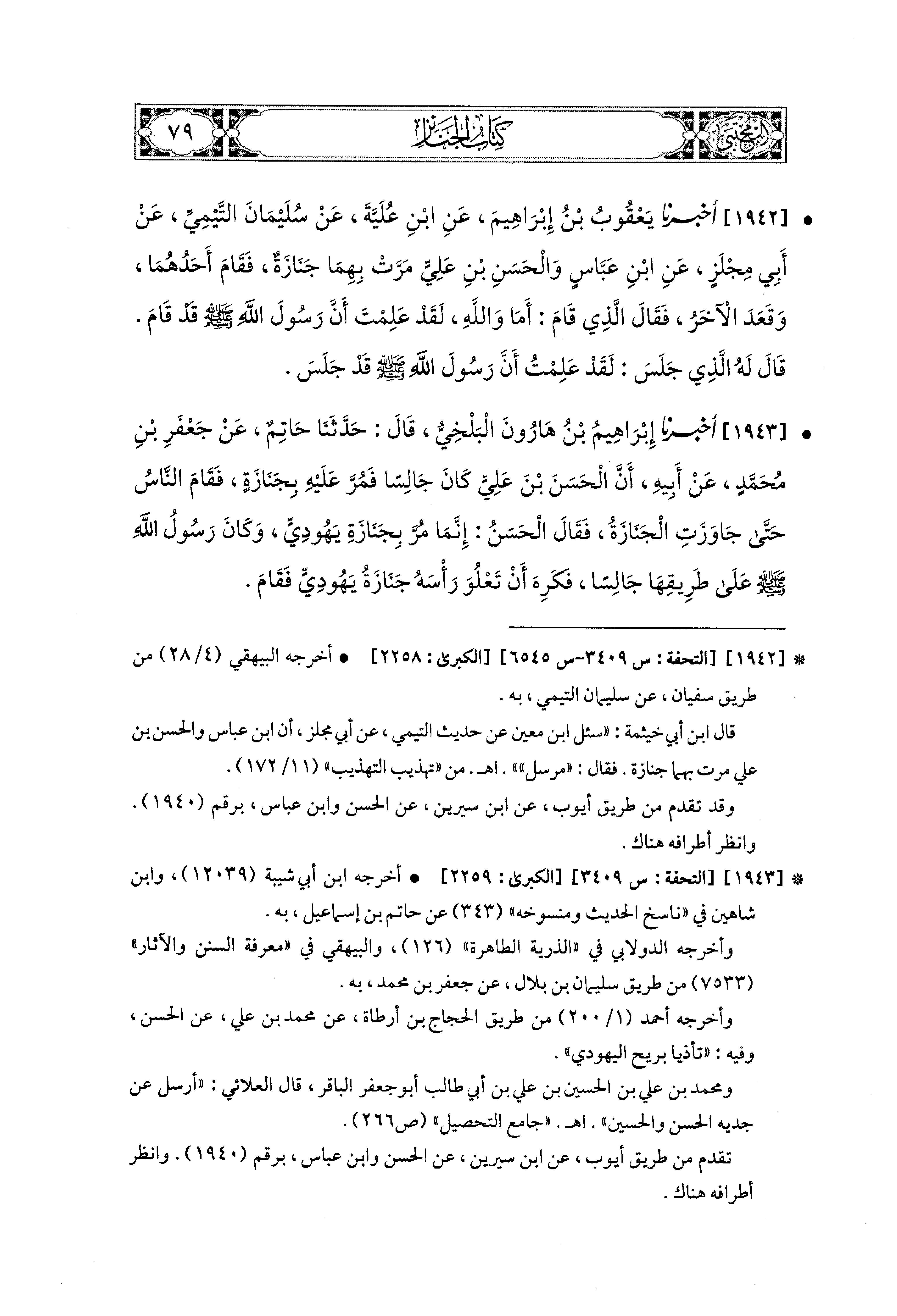 1943- أَخبَرَنا إِبراهِيمُ بْنُ هَارُونَ البَلْخِيُّ، قال: حَدثنا حَاتِمٌ، عَن جَعْفَرِ بْنِ مُحَمدٍ، عَن أَبيهِ، أَنَّ الحَسَنَ بْنَ عَلِيٍّ كَانَ جَالِسًا فَمُرَّ عَلَيهِ بِجَنَازَةٍ، فَقَامَ النَّاسُ حَتَّى جَاوَزَتِ الجَنَازَةُ، فَقَالَ الحَسَنُ: إِنَّمَا مُرَّ بِجَنَازَةِ يَهُودِيٍّ وَكَانَ رَسُولُ اللهِ صَلى الله عَليه وسَلم عَلَى طَرِيقِهَا جَالِسًا، فَكَرِهَ أَنْ تَعْلُوَ رَأْسَهُ جَنَازَةُ يَهُودِيٍّ، فَقَامَ.