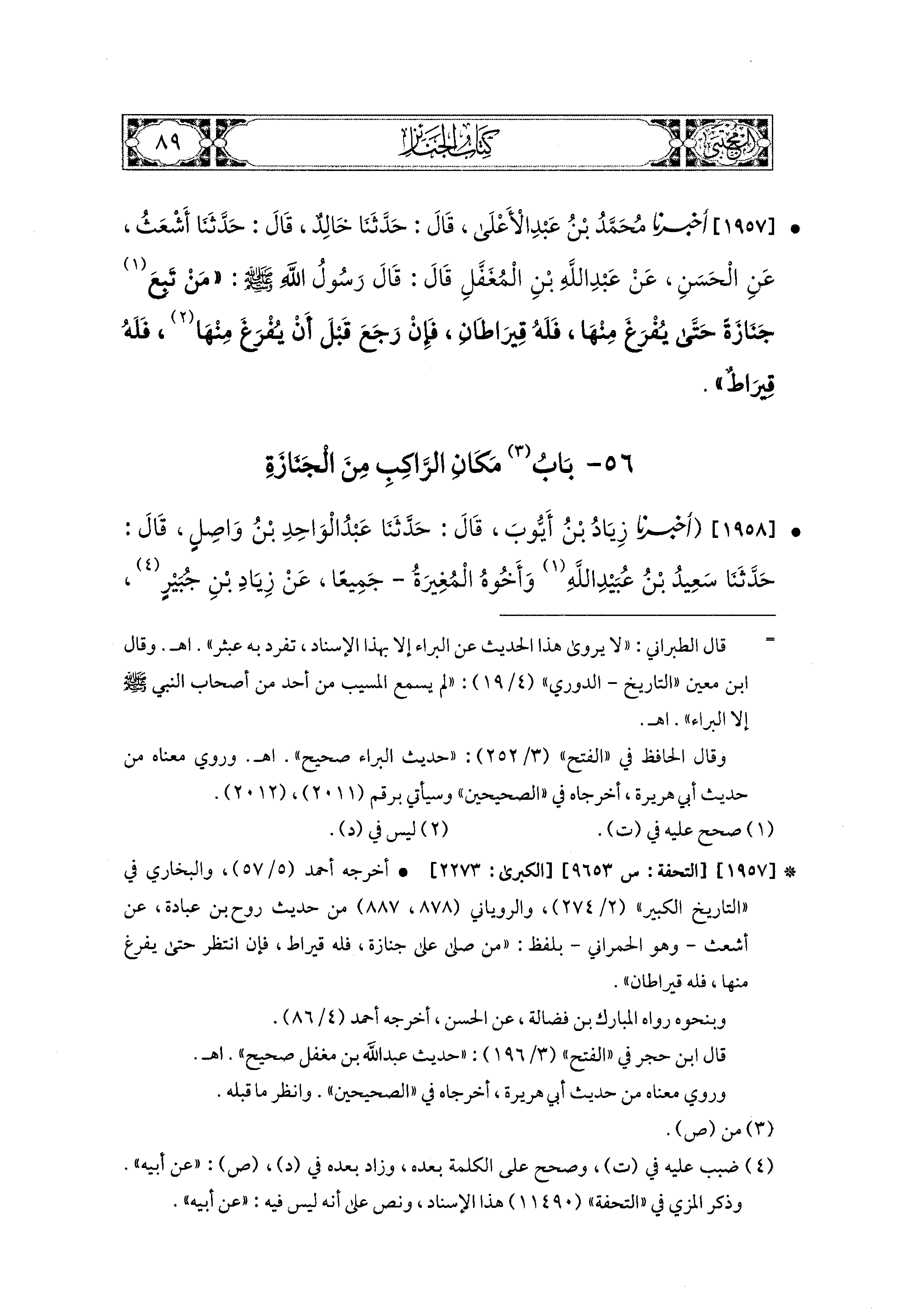 1958- أَخبَرَنا زِيَادُ بْنُ أَيُّوبَ، قال: حَدثنا عَبدُ الوَاحِدِ بْنُ وَاصِلٍ، قال: حَدثنا سَعيدُ بْنُ عُبَيدِ اللهِ، وَأَخُوهُ المُغِيرَةُ جَميعًا، عَن زِيَادِ بْنِ جُبَيْرٍ (1)، عَنِ المُغِيرَةِ بْنِ شُعبَةَ قَالَ: قَالَ رَسُولُ اللهِ صَلى الله عَليه وسَلم الرَّاكِبُ خَلْفَ الجَنَازَةِ، وَالمَاشِي حَيْثُ شَاءَ، وَالطِّفْلُ يُصَلَّى عَلَيهِ.