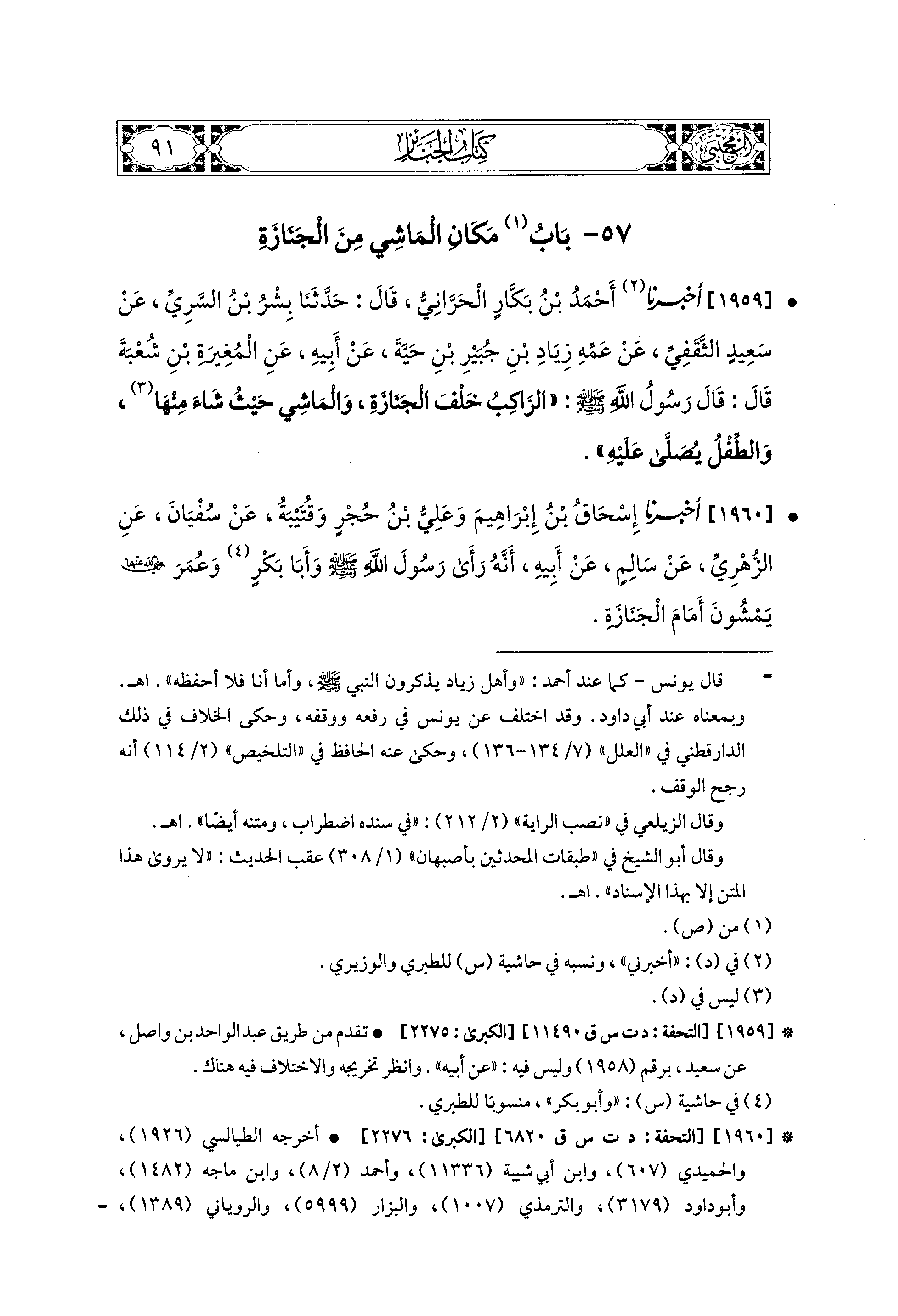 1960- أَخبَرَنا إِسحَاقُ بْنُ إِبراهِيمَ، وَعَلِيُّ بْنُ حُجْرٍ، وَقُتَيبَةُ، عَن سُفيَانَ، عَنِ الزُّهْرِيِّ، عَن سَالِمٍ، عَن أَبيهِ، أَنَّهُ رَأَى رَسُولَ اللهِ صَلى الله عَليه وسَلم، وَأَبَا بَكْرٍ، وَعُمَرَ رَضِيَ اللهُ عَنهُمَا يَمْشُونَ أَمَامَ الجَنَازَةِ.