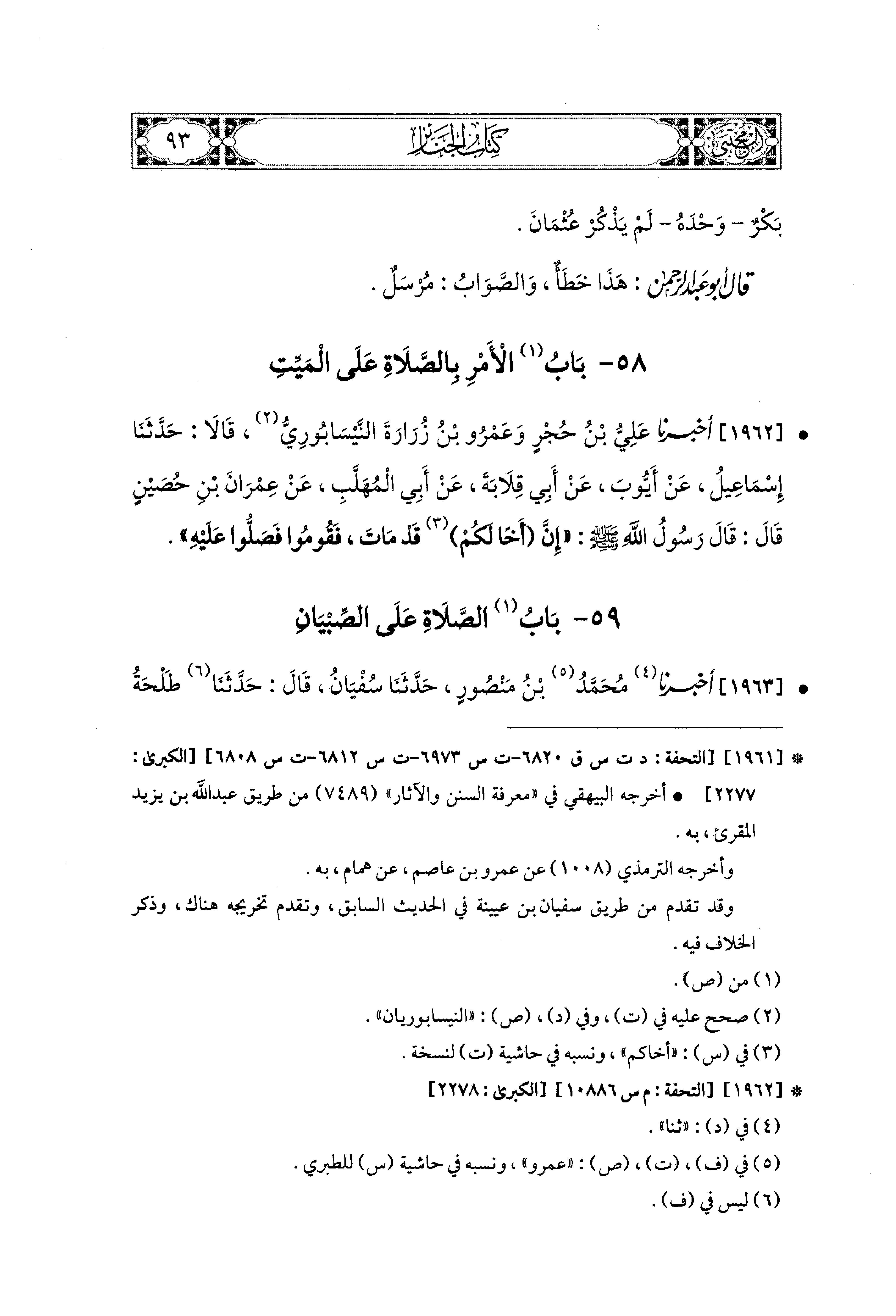 1962- أَخبَرَنا عَلِيُّ بْنُ حُجْرٍ، وَعَمْرُو بْنُ زُرَارَةَ النَّيْسَابُورِيُّ، قَالاَ: حَدَّثَنَا إِسماعِيلُ، عَن أَيُّوبَ، عَن أَبي قِلاَبَةَ، عَن أَبي المُهَلَّبِ، عَن عِمْرَانَ بْنِ حُصَيْنٍ قَالَ: قَالَ رَسُولُ اللهِ صَلى الله عَليه وسَلم: إِنَّ أَخَاً لكُمْ قَدْ مَاتَ فَقُومُوا فَصَلُّوا عَلَيهِ.