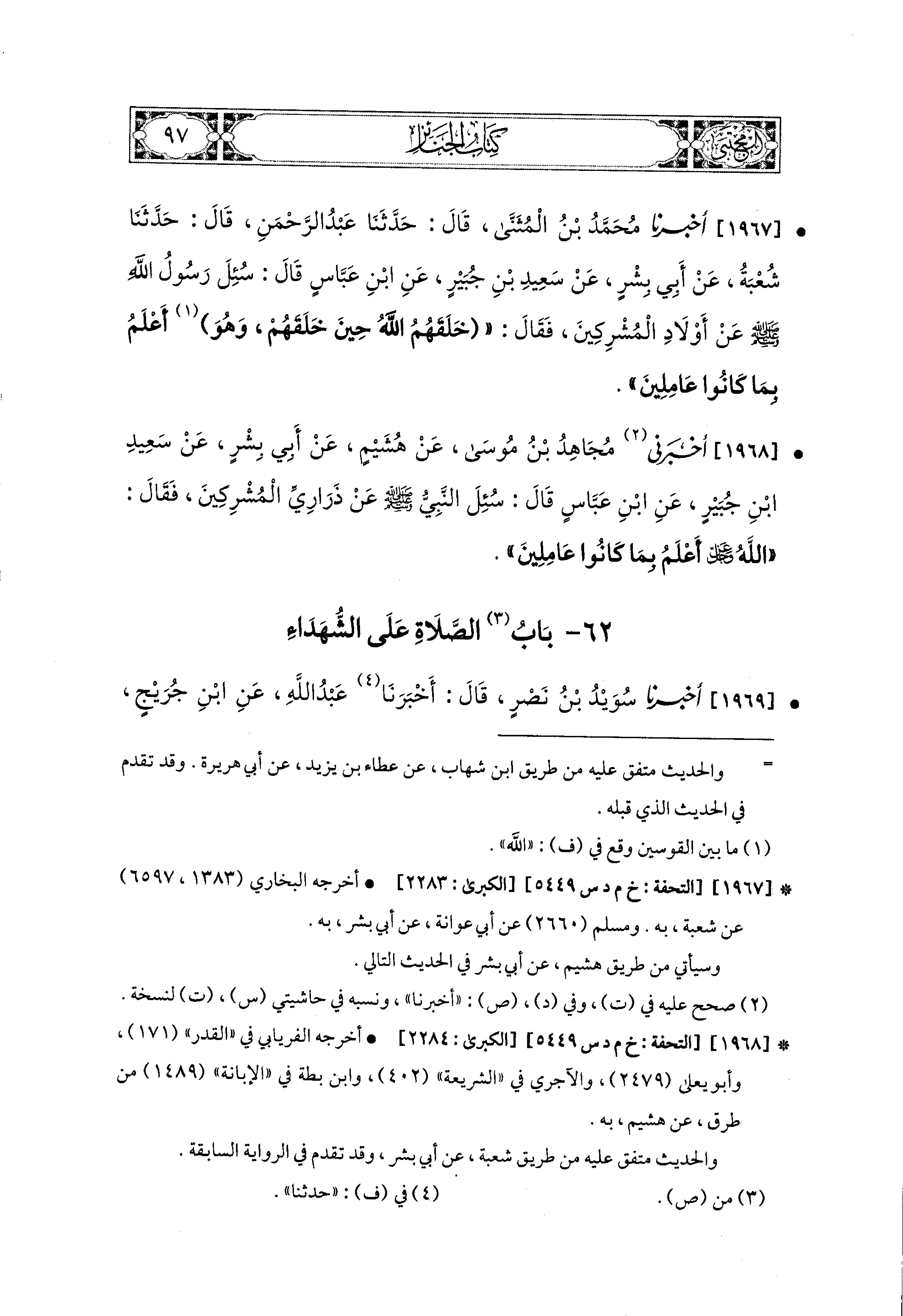 1968- أَخبَرني مُجَاهِدُ بْنُ مُوسَى، عَن هُشَيْمٍ، عَن أَبي بِشْرٍ، عَن سَعيدِ بْنِ جُبَيْرٍ، عَنِ ابنِ عَبَّاسٍ، قَالَ: سُئِلَ النَّبيُّ صَلى الله عَليه وسَلم عَن ذَرَارِيِّ المُشْرِكِينَ، فَقَالَ: اللهُ عَزَّ وَجَلَّ أَعْلَمُ بِمَا كَانُوا عَامِلِينَ.