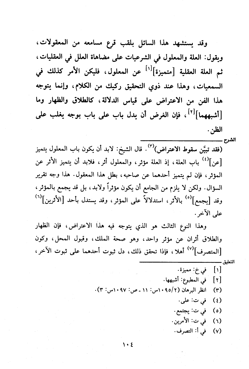 (فقد تبين سقوط الاعتراض). قال الشيخ: لا بد أن يكون باب المعلول يتميز [عن] باب العلة، إذ العلة مؤثر، والمعلول أثر، فلا بد أن يتميز الأثر عن المؤثر، فإن لم يتميز أحدهما عن صاحبه، بطل هذا المعقول. هذا وجه تقرير السؤال. ولكن لا يلزم من الجامع أن يكون مؤثرًا ولا بد، بل قد يجمع بالمؤثر، وقد [يجمع] بالأثر، استدلالًا على المؤثر، وقد يستدل بأحد [الأثرين] على الآخر.