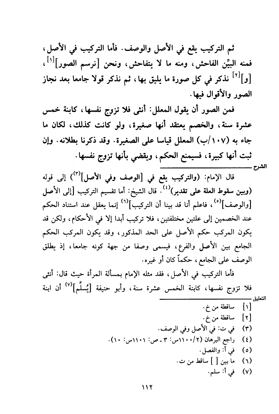 قال الإمام: (والتركيب يقع في [الوصف وفي الأصل]) إلى قوله (وبين سقوط العلة على تقدير). قال الشيخ: أما تقسيم التركيب [إلى الأصل [والوصف]، فاعلم أنا قد بينا أن التركيب] إنما يعقل عند استناد الحكم عند الخصمين إلى علتين مختلفتين، فلا تركيب أبدًا إلا في الأحكام، ولكن قد يكون المركب حكم الأصل على الحد المذكور، وقد يكون المركب الحكم الجامع بين الأصل والفرع، فيسمى وصفًا من جهة كونه جامعًا، إذ يطلق الوصف على الجامع، حكمًا كان أو غيره.
