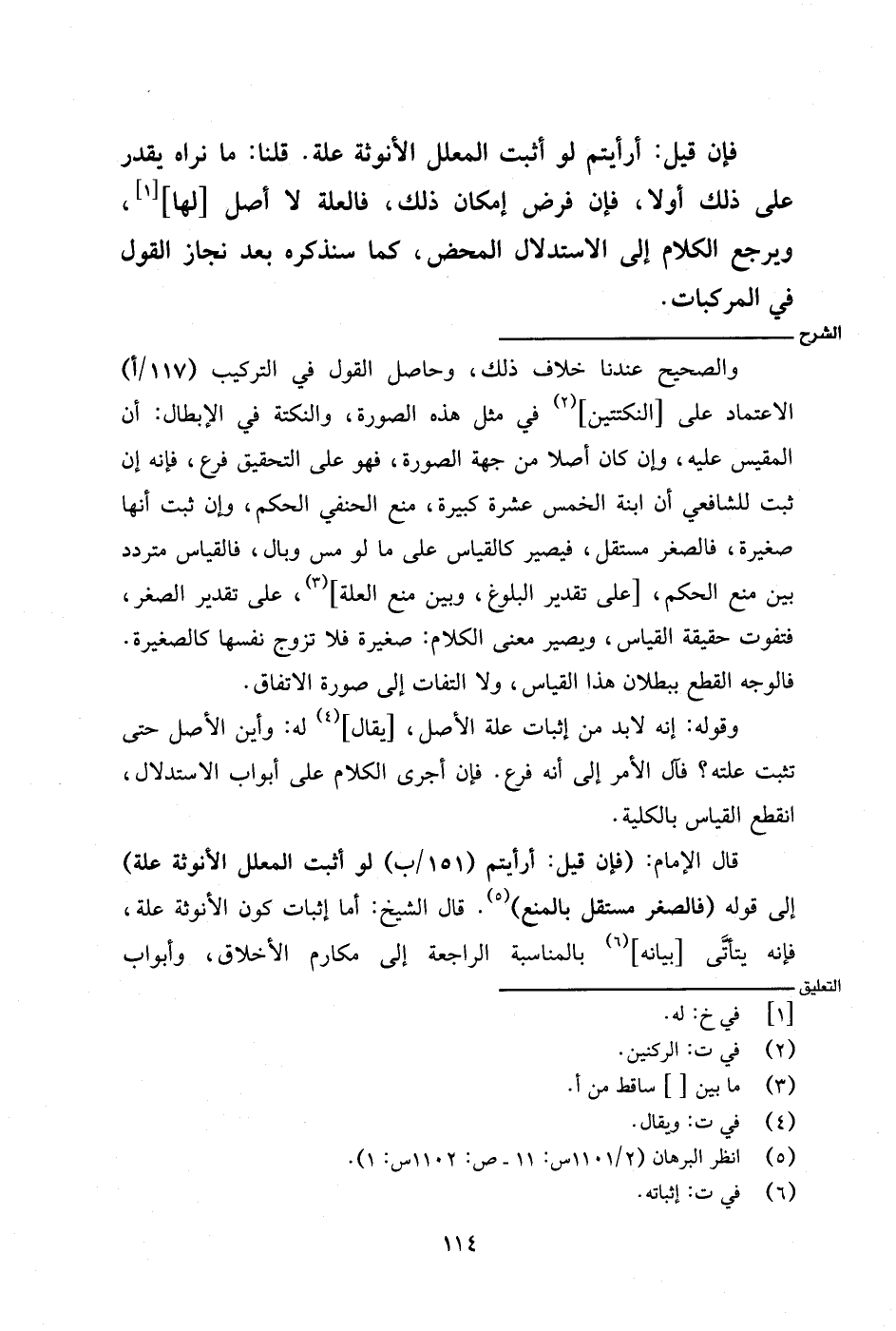 قال الإمام: (فإن قيل: أرأيتم (١٥١/ ب) لو أثبت المعلل الأنوثة علة) إلى قوله (فالصغر مستقل بالمنع). قال الشيخ: أما إثبات كون الأنوثة علة، فإنه يتأتى [بيانه] بالمناسبة الراجعة إلى مكارم الأخلاق، وأبواب