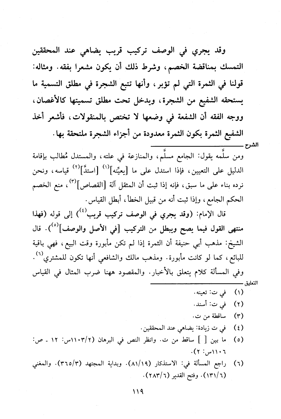 قال الإمام: (وقد يجري في الوصف تركيب قريب) إلى قوله (فهذا منتهى القول فيما يصح ويبطل من التركيب [في الأصل والوصف]). قال الشيخ: مذهب أبي حنيفة أن الثمرة إذا لم تكن مأبورة وقت البيع، فهي باقية للبائع، كما لو كانت مأبورة. ومذهب مالك والشافعي أنها تكون للمشتري. وفي المسألة كلام يتعلق بالأخبار. والمقصود ها هنا ضرب المثال في القياس