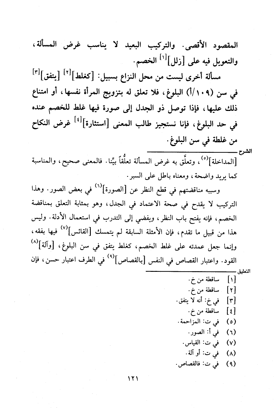 وسببه مناقضتهم في قطع النظر عن [الصورة] في بعض الصور. وهذا التركيب لا يقدح في صحة الاعتماد في الجدل، وهو بمثابة التعلق بمناقضة الخصم، فإنه يفتح باب النظر، ويفضي إلى التدرب في استعمال الأدلة. وليس هذا من قبيل ما تقدم، فإن الأمثلة السابقة لم يتمسك [القائس] فيها بفقه، وإنما جعل عمدته على غلط الخصم، كغلط يتفق في سن البلوغ، [وآلة] القود. واعتبار القصاص في النفس [بالقصاص] في الطرف اعتبار حسن، فإن