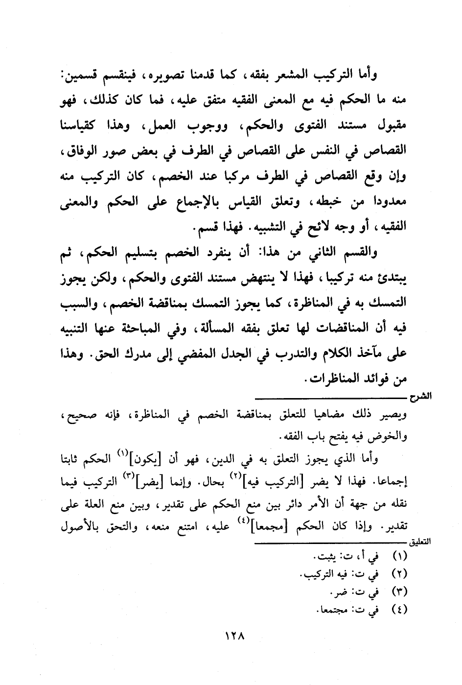 وأما الذي يجوز التعلق به في الدين، فهو أن [يكون] الحكم ثابتًا إجماعًا. فهذا لا يضر [التركيب فيه] بحال. وإنما [يضر] التركيب فيما نقله من جهة أن الأمر دائر بين منع الحكم على تقدير، وبين منع العلة على تقدير. وإذا كان الحكم [مجمعًا] عليه، امتنع منعه، والتحق بالأصول