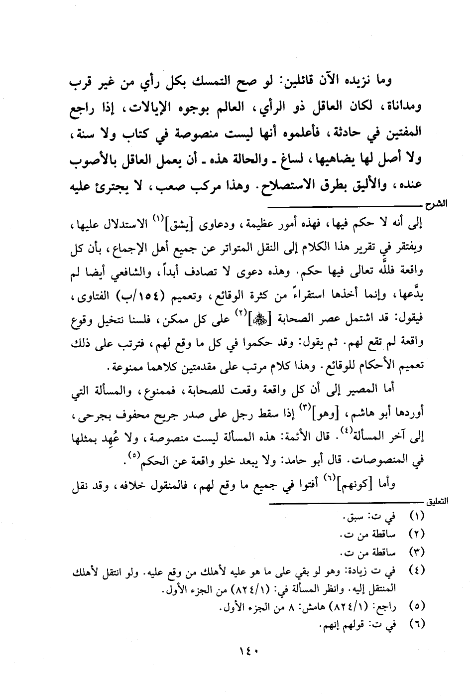 أما المصير إلى أن كل واقعة وقعت للصحابة، فممنوع، والمسألة التي أوردها أبو هاشم، [وهو] إذا سقط رجل على صدر جريح محفوف بجرحى، إلى آخر المسألة. قال الأئمة: هذه المسألة ليست منصوصة، ولا عهد بمثلها في المنصوصات. قال أبو حامد: ولا يبعد خلو واقعة عن الحكم.