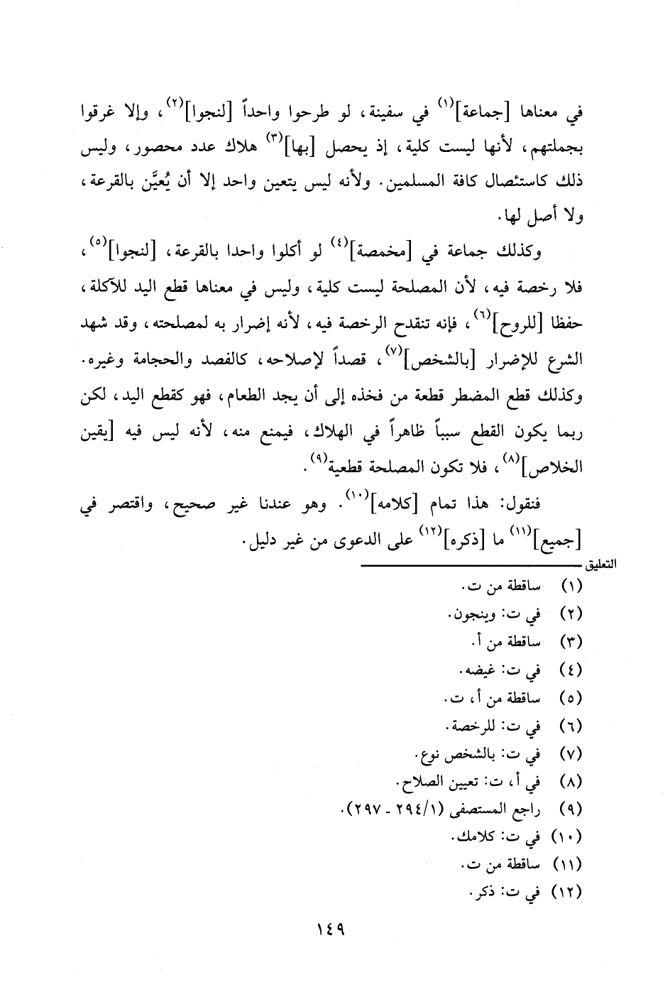 وكذلك جماعة في [مخمصة] لو أكلوا واحدًا بالقرعة، [لنجوا]، فلا رخصة فيه، لأن المصلحة ليست كلية، وليس في معناها قطع اليد للآكلة، حفظًا [للروح]، فإنه تنقدح الرخصة فيه، لأنه إضرار به لمصلحته، وقد شهد الشرع للإضرار [بالشخص]، قصدًا لإصلاحه، كالفصد والحجامة وغيره. وكذلك قطع المضطر سببًا ظاهرًا في الهلاك، فيمنع منه، لأنه ليس فيه [يقين الخلاص]، فلا تكون المصلحة قطعية.