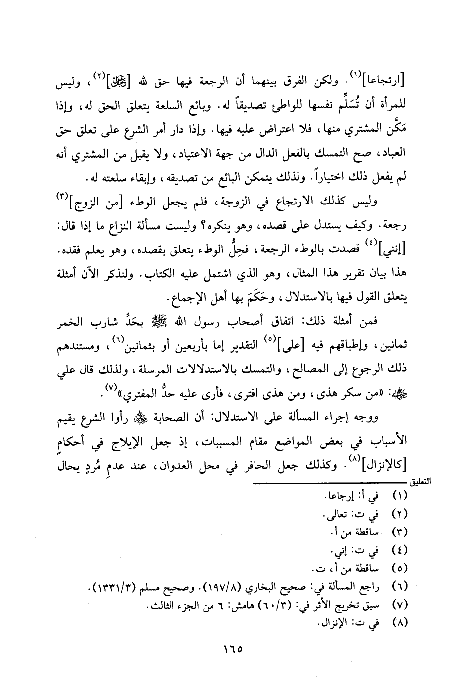وليس كذلك الارتجاع في الزوجة، فلم يجعل الوطء [من الزوج] رجعة. وكيف يستدل على قصده، وهو ينكره؟ وليست مسألة النزاع ما إذا قال: [إنني] قصدت بالوطء الرجعة، فحل الوطء يتعلق بقصده، وهو يعلم فقده. هذا بيان تقرير هذا المثال، وهو الذي اشتمل عليه الكتاب. ولنذكر الآن أمثلة يتعلق القول فيها بالاستدلال، وحكم بها أهل الإجماع.