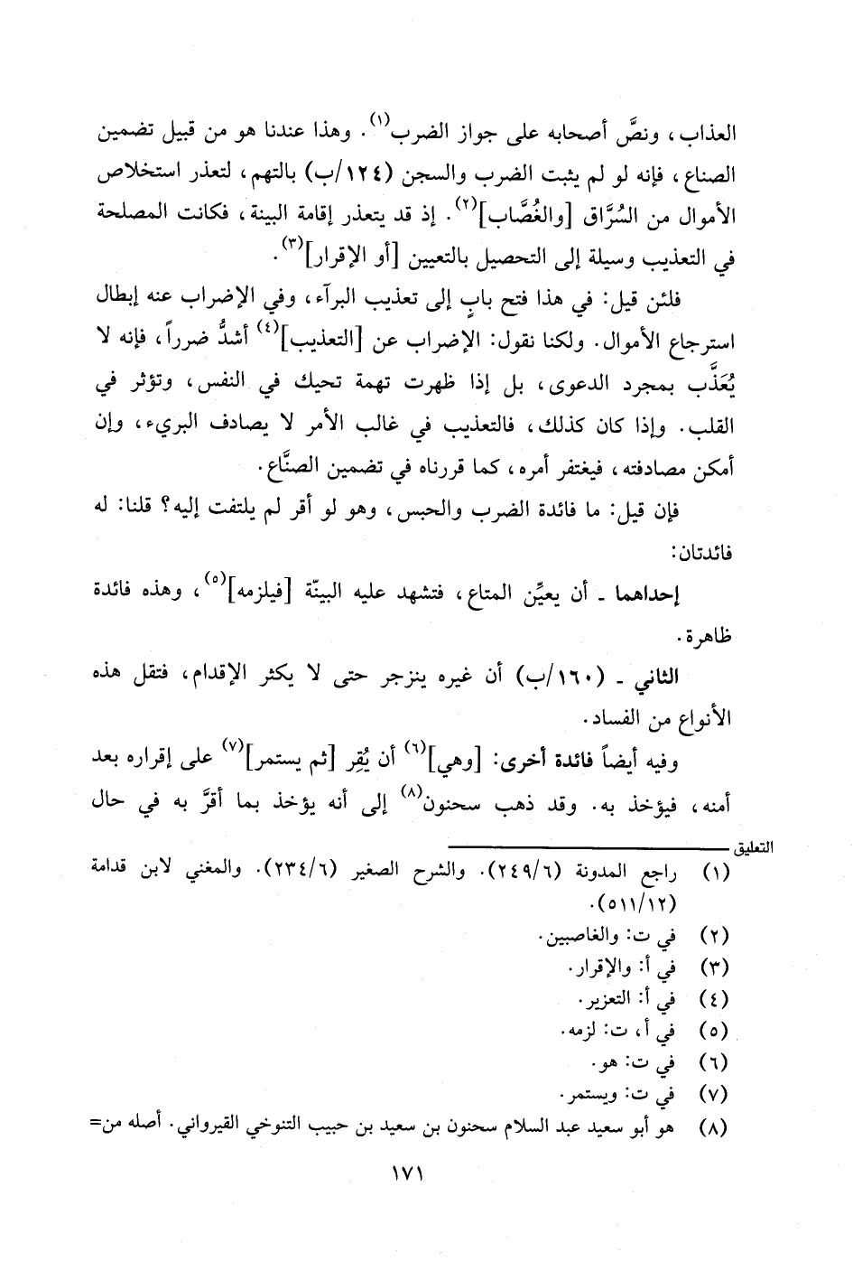 العذاب، ونص أصحابه على جواز الضرب. وهذا عندنا هو من قبيل تضمين الصناع، فإنه لو لم يثبت الضرب والسجن [١٢٤/ ب) بالتهم، لتعذر استخلاص الأموال من السراق [والغصاب]. إذ قد يتعذر إقامة البينة، فكانت المصلحة في التعذيب وسيلة إلى التحصيل بالتعيين [أو الإقرار].