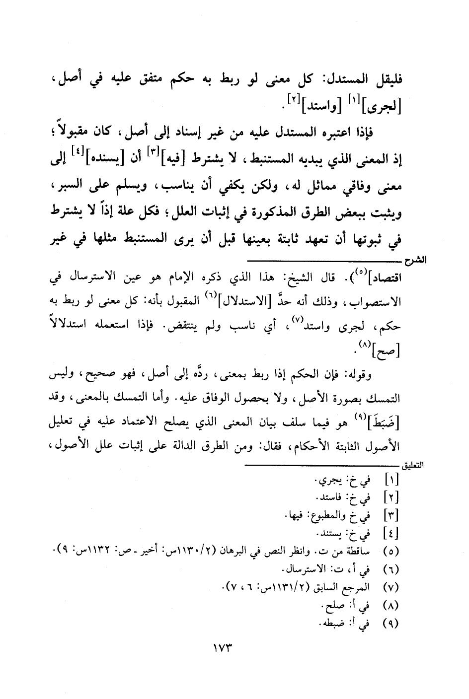 اقتصاد]). قال الشيخ: هذا الذي ذكره الإمام هو عين الاسترسال في الاستصواب، وذلك أنه حد [الاستدلال] المقبول بأنه: كل معنى لو ربط به حكم، لجرى واستد، أي ناسب ولم ينتقض. فإذا استعمله استدلالًا [صح].
