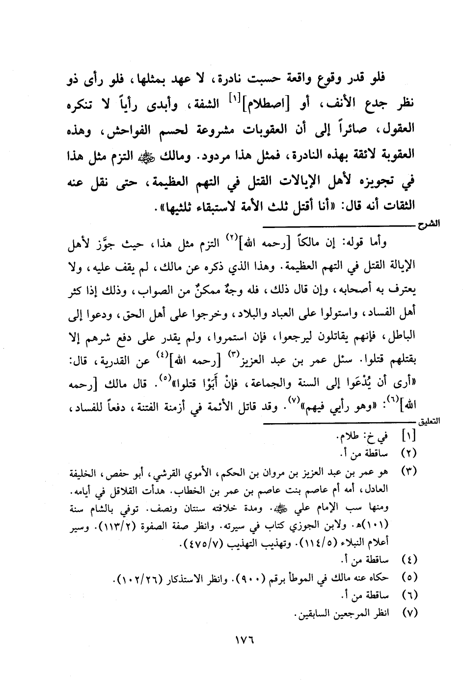 وأما قوله: إن مالكًا [رحمه الله] التزم مثل هذا، حيث جوز لأهل الإيالة القتل في التهم العظيمة. وهذا الذي ذكره عن مالك، لم يقف عليه، ولا يعترف به أصحابه، وإن قال ذلك، فله وجه ممكن من الصواب، وذلك إذا كثر أهل الفساد، واستولوا على العباد والبلاد، وخرجوا على أهل الحق، ودعوا إلى الباطل، فإنهم يقاتلون ليرجعوا، فإن استمروا، ولم يقدر على دفع شرهم إلا بقتلهم قتلوا. سئل عمر بن عبد العزيز [رحمه الله] عن القدرية، قال: "أرى أن يُدعوا غلى السنة والجماعة، فإن أبوا قتلوا". قال مالك [رحمه الله]: "وهو رأيي فيهم". وقد قاتل الأئمة في أزمنة الفتنة، دفعًا للفساد،