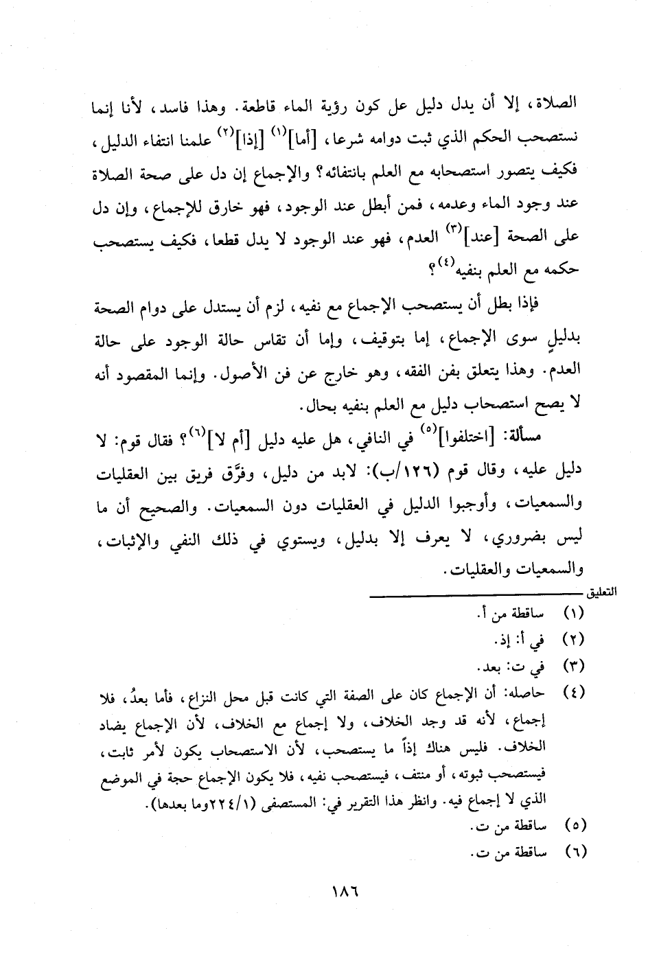 فإذا بطل أن يستصحب الإجماع مع نفيه، لزم أن يستدل على دوام الصحة بدليل سوى الإجماع، إما بتوقيف، وإما أن تقاس حالة الوجود على حالة العدم. وهذا يتعلق بفن الفقه، وهو خارج عن فن الأصول. وإنما المقصود أنه لا يصح استصحاب دليل مع العلم بنفيه بحال.