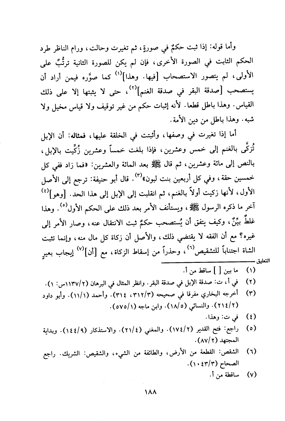 أما إذا تغيرت في وصفها، وأثبتت في الخلقة عليها، فمثاله: أن الإبل تُزكى بالغنم إلى خمس وعشرين، فإذا بلغت خمسًا وعشرين زُكيت بالإبل، بالنص إلى مائة وعشرين، ثم قال - صلى الله عليه وسلم - بعد المائة والعشرين: "فما زاد ففي كل خمسين حقة، وفي كل أربعين بنت لبون". قال أبو حنيفة: ترجع إلى الأصل الأول، لأنها زكيت أولًا بالغنم، ثم انقلبت إلى الإبل إلى هذا الحد. [وهو] آخر ما ذكره الرسول - صلى الله عليه وسلم -، ويستأنف الأمر بعد ذلك على الحكم الأول. وهذا غلط بين، وكيف يتفق أن يُستصحب حكم ثبت الانتقال عنه، وصار الأمر إلى غيره؟ مع أن الفقه لا يقتضي ذلك، والأصل أن زكاة كل مال منه، وإنما تثبت الشاة اجتنابًا للتشقيص، وحذرًا من إسقاط الزكاة، مع [أن] إيجاب بعير