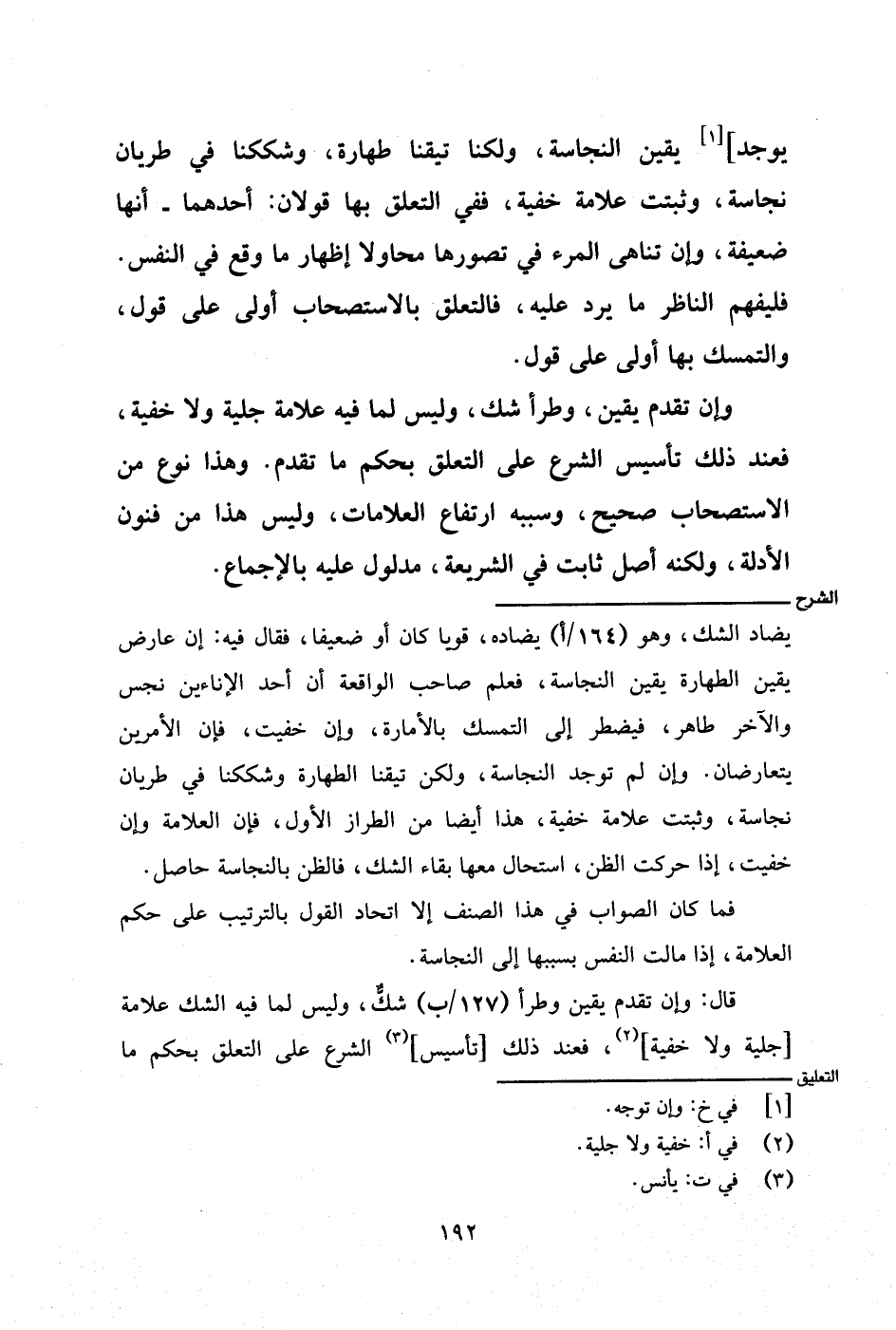يضاد الشك، وهو (١٦٤/ أ) يضاده، قويًّا كان أو ضعيفًا، فقال فيه: إن عارض يقين الطهارة يقين النجاسة، فعلم صاحب الواقعة أن أحد الإناءين نجس والآخر طاهر، فيضطر إلى التمسك بالأمارة، وإن خفيت، فإن الأمرين يتعارضان. وإن لم توجد النجاسة، ولكن تيقنا الطهارة وشككنا في طريان نجاسة، وثبتت علامة خفية، هذا أيضًا من الطراز الأول، فإن العلامة وإن خفيت، إذا حركت الظن، استحال معها بقاء الشك، فالظن بالنجاسة حاصل.