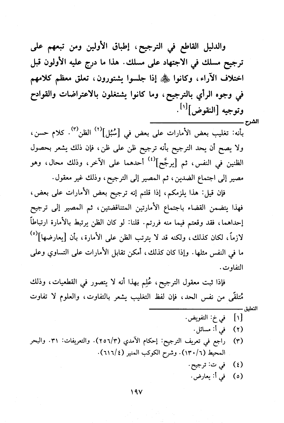 فإن قيل: هذا يلزمكم، إذا قلتم إنه ترجيح بعض الأمارات على بعض، فهذا يتضمن القضاء باجتماع الأمارتين المتناقضتين، ثم المصير إلى ترجيح إحداهما، فقد وقعتم فيما منه فررتم. قلنا: لو كان الظن يرتبط بالأمارة ارتباطًا لازمًا، لكان كذلك، ولكنه قد لا يترتب الظن على الأمارة، بأن [يعارضها] ما في النفس مثلها. وإذا كان كذلك، أمكن تقابل الأمارات على التساوي وعلى التفاوت.