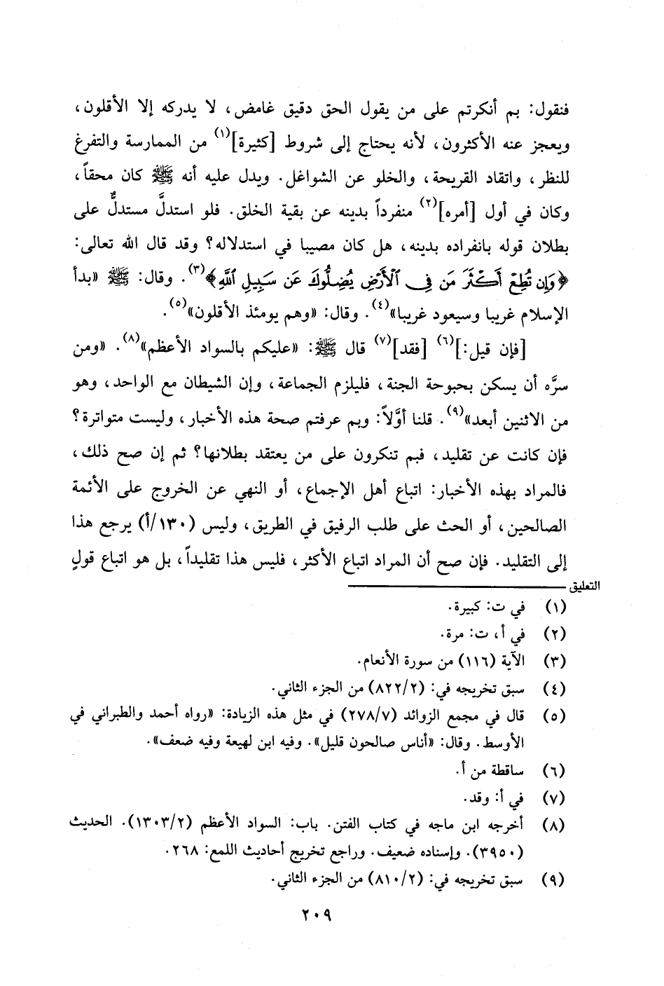 [فإن قيل: ] [فقد] قال - صلى الله عليه وسلم -: "عليكم بالسواد الأعظم". "ومن سره أن يسكن بحبوحة الجنة، فليلزم الجماعة، وإن الشيطان مع الواحد، وهو من الاثنين أبعد". قلنا أولًا: وبم عرفتم صحة هذه الأخبار، وليست متواترة؟ فإن كانت عن تقليد، فبم تنكرون على من يعتقد بطلانها؟ ثم إن صح ذلك، فالمراد بهذه الأخبار: اتباع أهل الإجماع، أو النهي عن الخروج على الأئمة الصالحين، أو الحث على طلب الرفيق في الطريق، وليس (١٣٠/ أ) يرجع هذا إلى التقليد. فإن صح أن المراد اتباع الأكثر، فليس هذا تقليدًا، بل هو اتباع قول