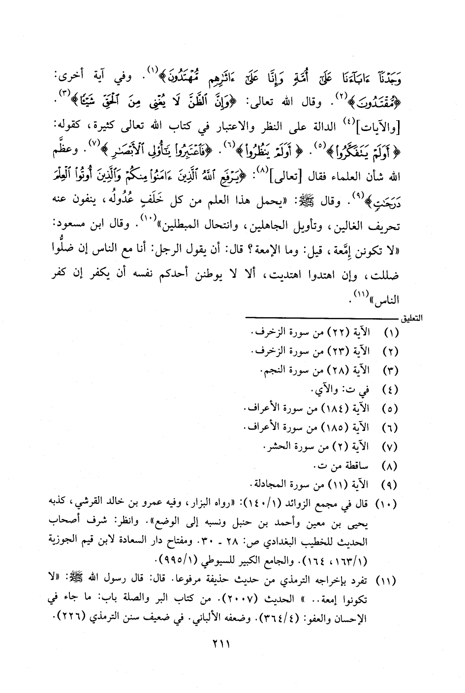 وجدنا آباءنا على أمة وإنا على آثارهم مهتدون}. وفي آية أخرى: {مقتدون}. وقال الله تعالى: {وإن الظن لا يغني من الحق شيئًا}. [والآيات] الدالة على النظر والاعتبار في كتاب الله تعالى كثيرة، كقوله: {أولم يتفكروا}. {أولم ينظروا}. {فاعتبروا يا أولي الأبصار}. وعظم الله شأن العلماء فقال [تعالى]: {يرفع الله الذين آمنوا منكم والذين أوتوا العلم درجات}. وقال - صلى الله عليه وسلم -: "يحمل هذا العلم من كل خلف عدوله، ينفون عنه تحريف الغالين، وتأويل الجاهلين، وانتحال المبطلين". وقال ابن مسعود: "لا تكونن إمعة، قيل: وما الإمعة؟ قال: أن يقول الرجل: أنا مع الناس إن ضلوا ضللت، وإن اهتدوا اهتديت، ألا لا يوطنن أحدكم نفسه أن يكفر إن كفر الناس".