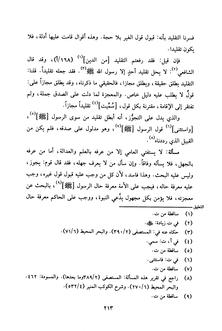 فإن قيل: فقد رفعتم التقليد [من الدين] (١٦٨/ أ)، وقد قال الشافعي: لا يحل تقليد أحد إلا رسول الله - صلى الله عليه وسلم -. فقد جعله تقليدًا. قلنا: التقليد يطلق حقيقة، ويطلق مجازًا، فالحقيقي ما ذكرناه، وقد يطلق مجازًا على: قول لا يطلب عليه دليل خاص. والمعجزة لما دلت على الصدق جملة، ولم تفتقر إلى الإقامة، مقترنة بكل قول، [سُميت] تقليدًا مجازًا.