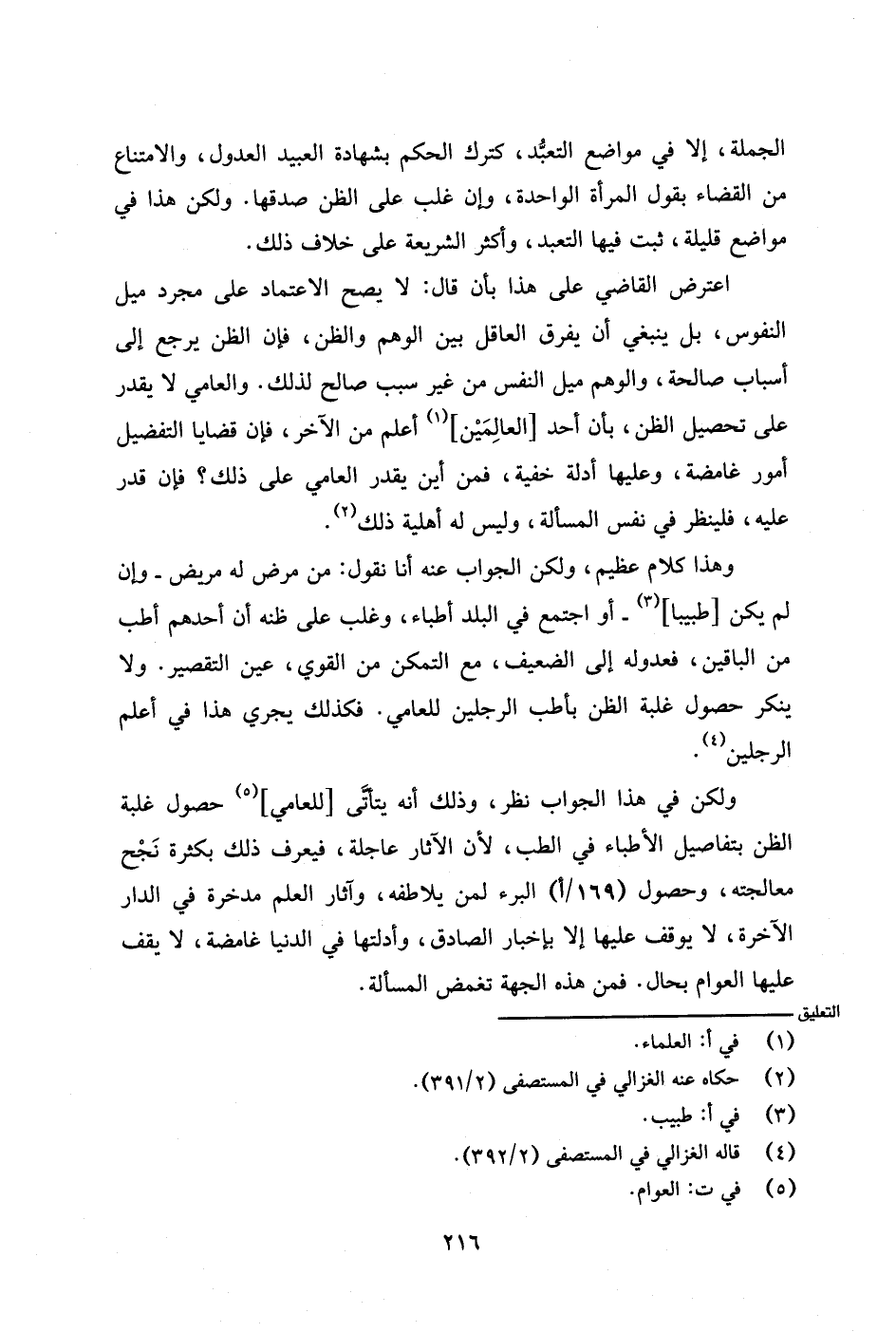 ولكن في هذا الجواب نظر، وذلك أنه يتأتى [للعامي] حصول غلبة الظن بتفاصيل الأطباء في الطب، لأن الآثار عاجلة، فيعرف ذلك بكثرة نجح معالجته، وحصول (١٦٩/ ا) البرء لمن يلاطفه، وآثار العلم مدخرة في الدار الآخرة، لا يوقف عليها إلا بإخبار الصادق، وأدلتها في الدنيا غامضة، لا يقف عليها العوام بحال. فمن هذه الجهة تغمض المسألة.