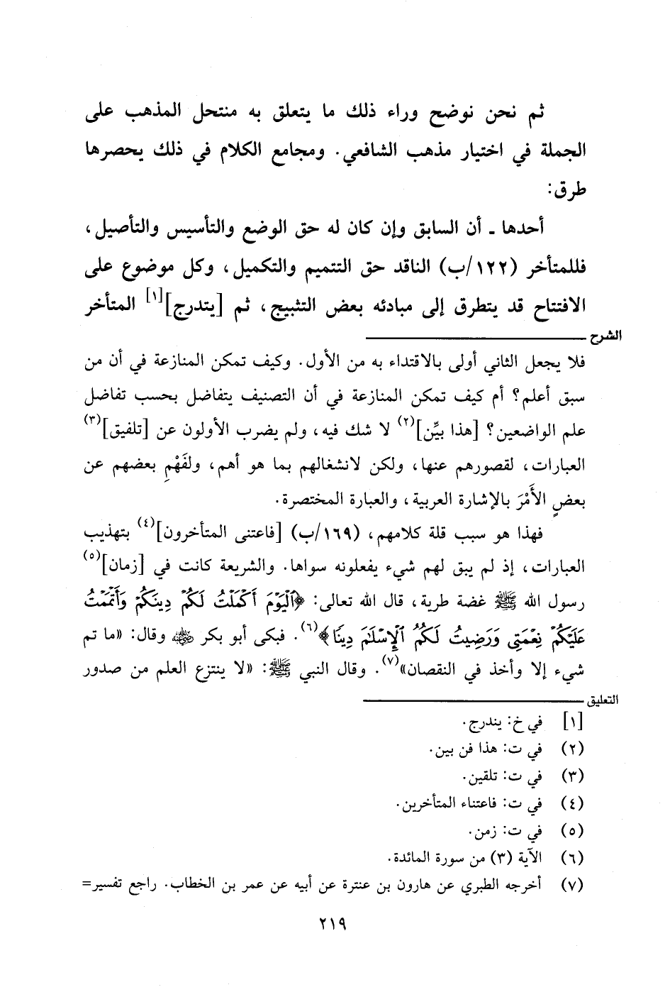 فهذا هو سبب قلة كلامهم، (١٦٩/ ب) [فاعتنى المتأخرون] بتهذيب العبارات، إذ لم يبق لهم شيء يفعلونه سواها. والشريعة كانت في [زمان] رسول الله - صلى الله عليه وسلم - غضة طرية، قال الله تعالى: {اليوم أكملت لكم دينكم وأتممت عليكم نعمتي ورضيت لكم الإسلام دينًا}. فبكى أبو بكر - رضي الله عنه - وقال: "ما تم شيء إلا وأخذ في النقصان". وقال النبي - صلى الله عليه وسلم -: "لا ينتزع العلم من صدور
