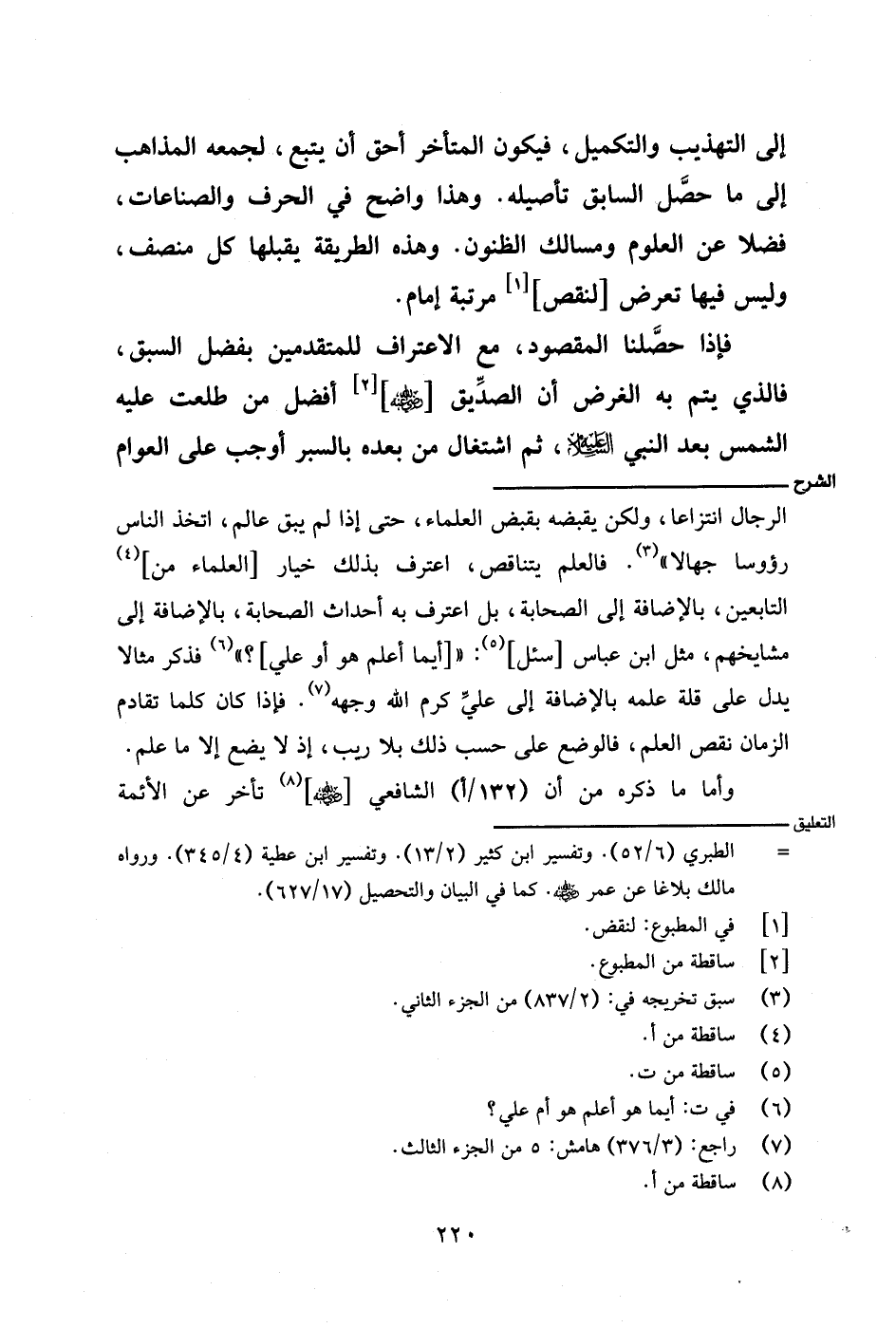 الرجال انتزاعًا، ولكن بقبض العلماء، حتى إذا لم يبق عالم، اتخذ الناس رؤوسًا جهالًا". فالعلم يتناقص، اعترف بذلك خيار [العلماء من] التابعين، بالإضافة إلى الصحابة، بل اعترف به أحداث الصحابة، بالإضافة إلى مشايخهم، مثل ابن عباس [سئل]: " [أيهما أعلم هو أو علي]." فذكر مثالًا يدل على قلة علمه بالإضافة إلى علي كرم الله وجهه. فإذا كان كلما تقادم الزمان نقص العلم، فالوضع على حسب ذلك بلا ريب، إذ لا يضع إلا ما علم.
