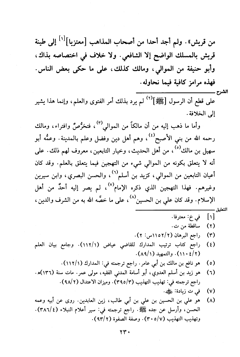 وأما ما ذهب إليه من أن مالكًا من الموالي، فتخرص وافتراء، ومالك رحمه الله من بني الأصبح، وهم أهل دين وفضل وعلم بالمدينة. وعمه أبو سهيل بن مالك، من أهل الحديث، وخيار التابعين، معروف لهم ذلك. على أنه لا يتعلق بكونه من الموالي شيء من التهجين فيما يتعلق بالعلم. وقد كان أعيان التابعين من الموالي، كزيد بن أسلم، والحسن البصري، وابن سيرين وغيرهم. فهذا التهجين الذي ذكره الإمام، لم يصر إليه أحد من أهل الإسلام. وقد كان علي بن الحسين، على ما خصه الله به من الشرف والدين،
