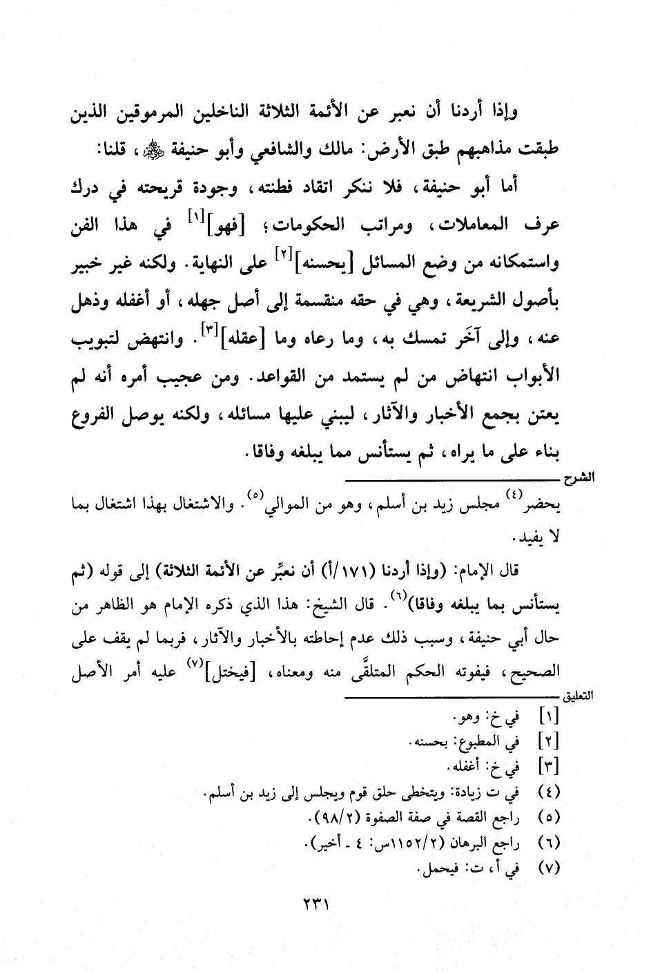قال الإمام: (وإذا أردنا (١٧١/ أ) أن نعبر عن الأئمة الثلاثة) إلى قوله (ثم يستأنس بما يبلغه وفاقا). قال الشيخ: هذا الذي ذكره الإمام هو الظاهر من حال أبي حنيفة، وسبب ذلك عدم إحاطته بالأخبار والآثار، فربما لم يقف على الصحيح، فيفوته الحكم المتلقى منه ومعناه، [فيختل] عليه أمر الأصل