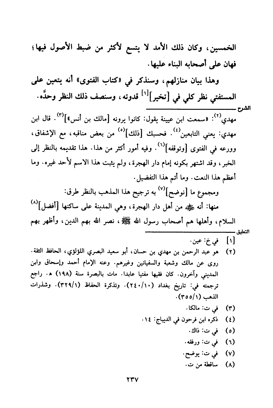 مهدي: "سمعت ابن عيينة يقول: كانوا يرونه [مالك بن أنس [. قال ابن مهدي: يعني التابعين. فحسبك [ذلك] من بعض مناقبه، مع الإشفاق، وورعه في الفتوى [وتوقفه]. وفيه أمور أكثر من هذا. هذا تقديمه بالنظر إلى الخبر، وقد اشتهر بكونه إمام دار الهجرة، ولم يثبت هذا الاسم لأحد غيره. وما أعظم هذا النعت. وما أتم هذا التفضيل.