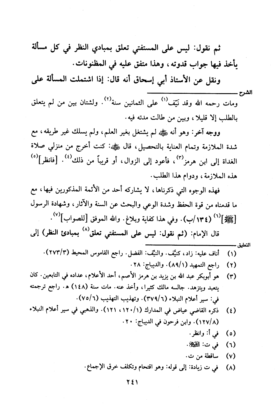 ووجه آخر: وهو أنه - رضي الله عنه - لم يشتغل بغير العلم، ولم يسلك غير طريقه، مع شدة الملازمة وتمام العناية بالتحصيل، قال - رضي الله عنه -: كنت أخرج من منزلي صلاة الغداة إلى ابن هرمز، فأعود إلى الزوال، أو قريبًا من ذلك. [فانظر] هذه الملازمة، ودوام هذا الطلب.