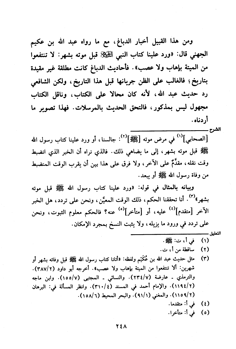 [الصحابي] في مرض موته [- صلى الله عليه وسلم -]: جالسنا، أو ورد علينا كتاب رسول الله - صلى الله عليه وسلم - قبل موته بشهر، إلى ما يضاهي ذلك. فالذي نراه أن الخبر الذي انضبط وقت نقله، مقدم على الآخر، ولا فرق على هذا بين أن يقرب الوقت المنضبط من وفاة رسول الله - صلى الله عليه وسلم - أو يبعد.