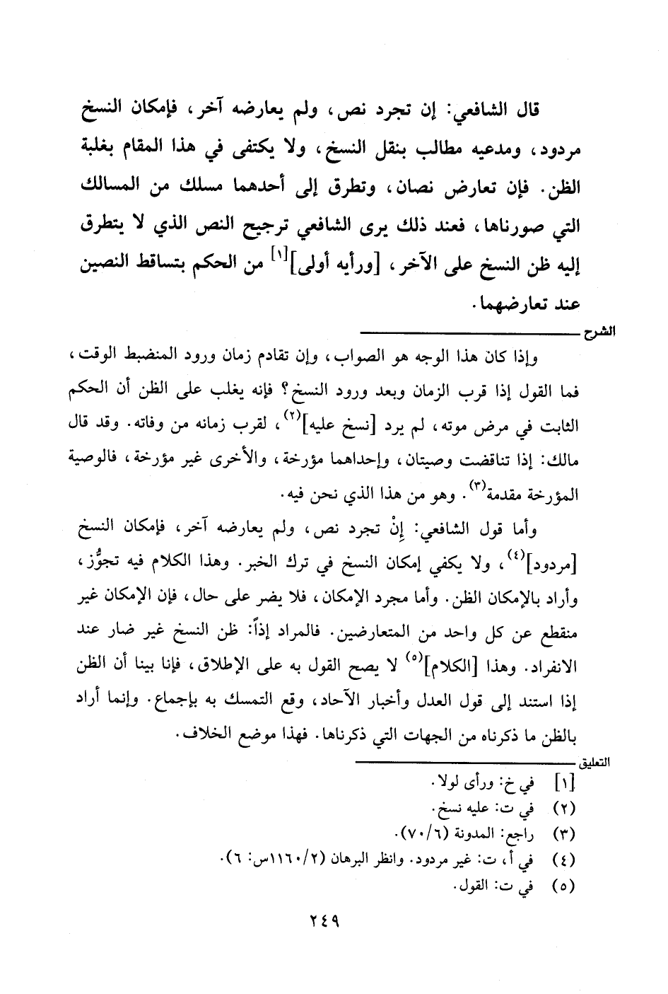 وأما قول الشافعي: إن تجرد نص، ولم يعارضه آخر، فإمكان النسخ [مردود]، ولا يكفي إمكان النسخ في ترك الخبر. وهذا الكلام فيه تجوز، وأراد بالإمكان الظن. وأما مجرد الإمكان، فلا يضر على حال، فإن الإمكان غير منقطع عن كل واحد من المتعارضين. فالمراد إذًا: ظن النسخ غير ضار عند الانفراد. وهذا [الكلام] لا يصح القول به على الإطلاق، فإنا بينا أن الظن إذا استند إلى قول العدل وأخبار الآحاد، وقع التمسك به بإجماع. وإنما أراد بالظن ما ذكرناه من الجهات التي ذكرناها. فهذا موضع الخلاف.