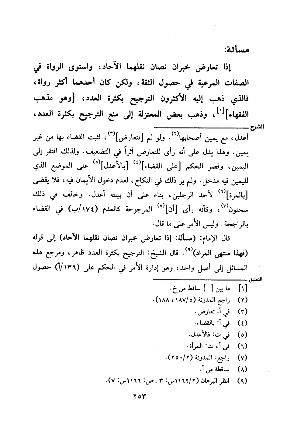 قال الإمام: (مسألة: إذا تعارض خبران نصان نقلهما الآحاد) إلى قوله (فهذا منتهى المراد). قال الشيخ: الترجيح بكثرة العدد ظاهر، ومرجع هذه المسائل إلى أصل واحد، وهو إدارة الأمر في الحكم على (١٣٦/ أ) حصول