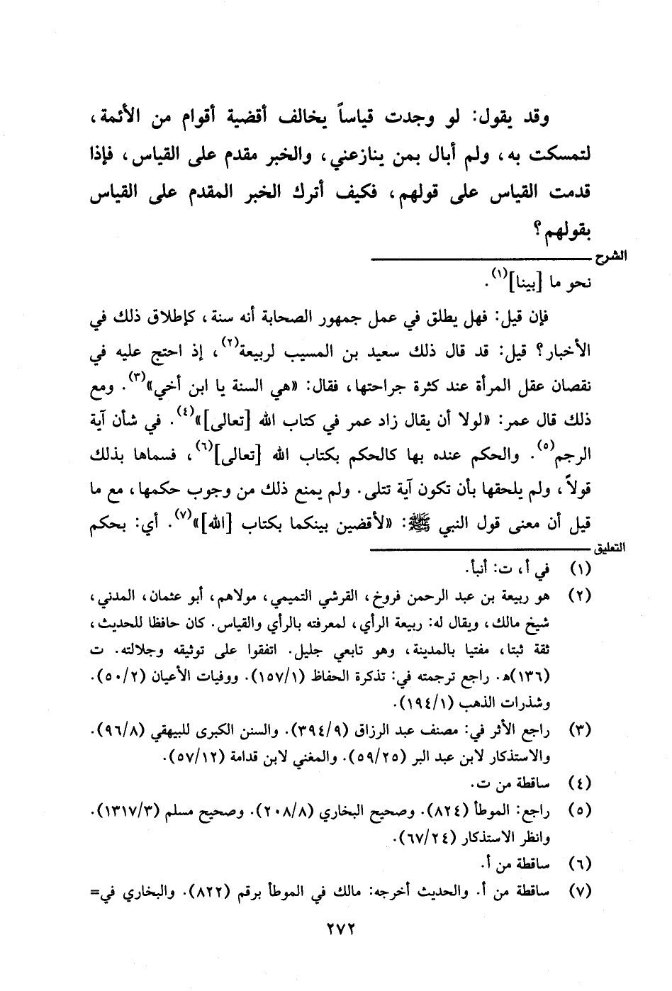 فإن قيل: فهل يطلق في عمل جمهور الصحابة أنه سنة، كإطلاق ذلك في الأخبار؟ قيل: قد قال ذلك سعيد بن المسيب لربيعة، إذ احتج عليه في نقصان عقل المرأة عند كثرة جراحتها، فقال: "هي السنة يا ابن أخي". ومع ذلك قال عمر: "لولا أن يقال زاد عمر في كتاب الله [تعالى] ". في شأن آية الرجم. والحكم عنده بها كالحكم بكتاب الله [تعالى]، فسماها بذلك قولًا، ولم يلحقها بأن تكون آية تتلى. ولم يمنع ذلك من وجوب حكمها، مع ما قيل أن معنى قول النبي - صلى الله عليه وسلم -: "لأقضين بينكما بكتاب [الله] ". أي: بحكم