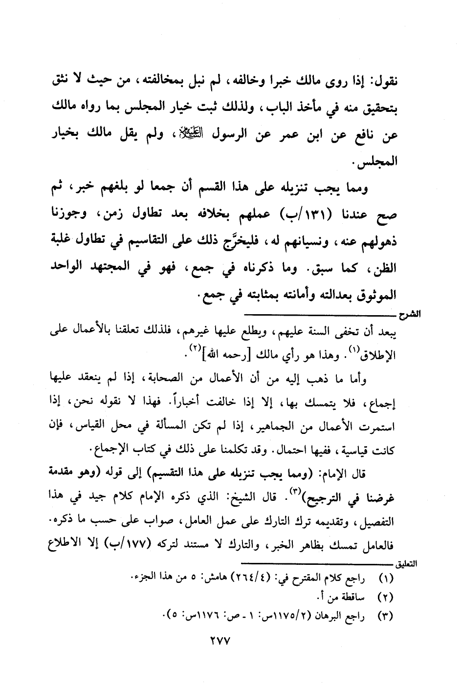 قال الإمام: (ومما يجب تنزيله على هذا التقسيم) إلى قوله (وهو مقدمة غرضنا في الترجيح). قال الشيخ: الذي ذكره الإمام كلام جيد في هذا التفصيل، وتقديمه ترك التارك على عمل العامل، صواب على حسب ما ذكره. فالعامل تمسك بظاهر الخبر، والتارك لا مستند لتركه (١٧٧/ ب) إلا الاطلاع