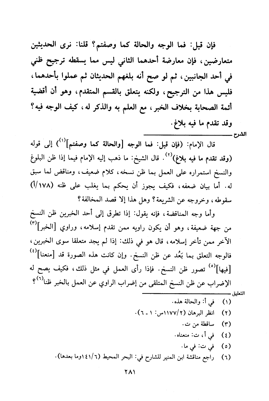 قال الإمام: (فإن قيل: فما الوجه [والحالة كما وصفتم]) إلى قوله (وقد تقدم ما فيه بلاغ). قال الشيخ: ما ذهب إليه الإمام فيما إذا ظن البلوغ والنسخ استمراره على العمل بما ظن نسخه، كلام ضعيف، ومناقض لما سبق له. أما بيان ضعفه، فكيف يجوز أن يحكم بما يغلب على ظنه (١٧٨/ أ) سقوطه، وخروجه عن الشريعة؟ وهل هذا إلا قصد المخالفة؟