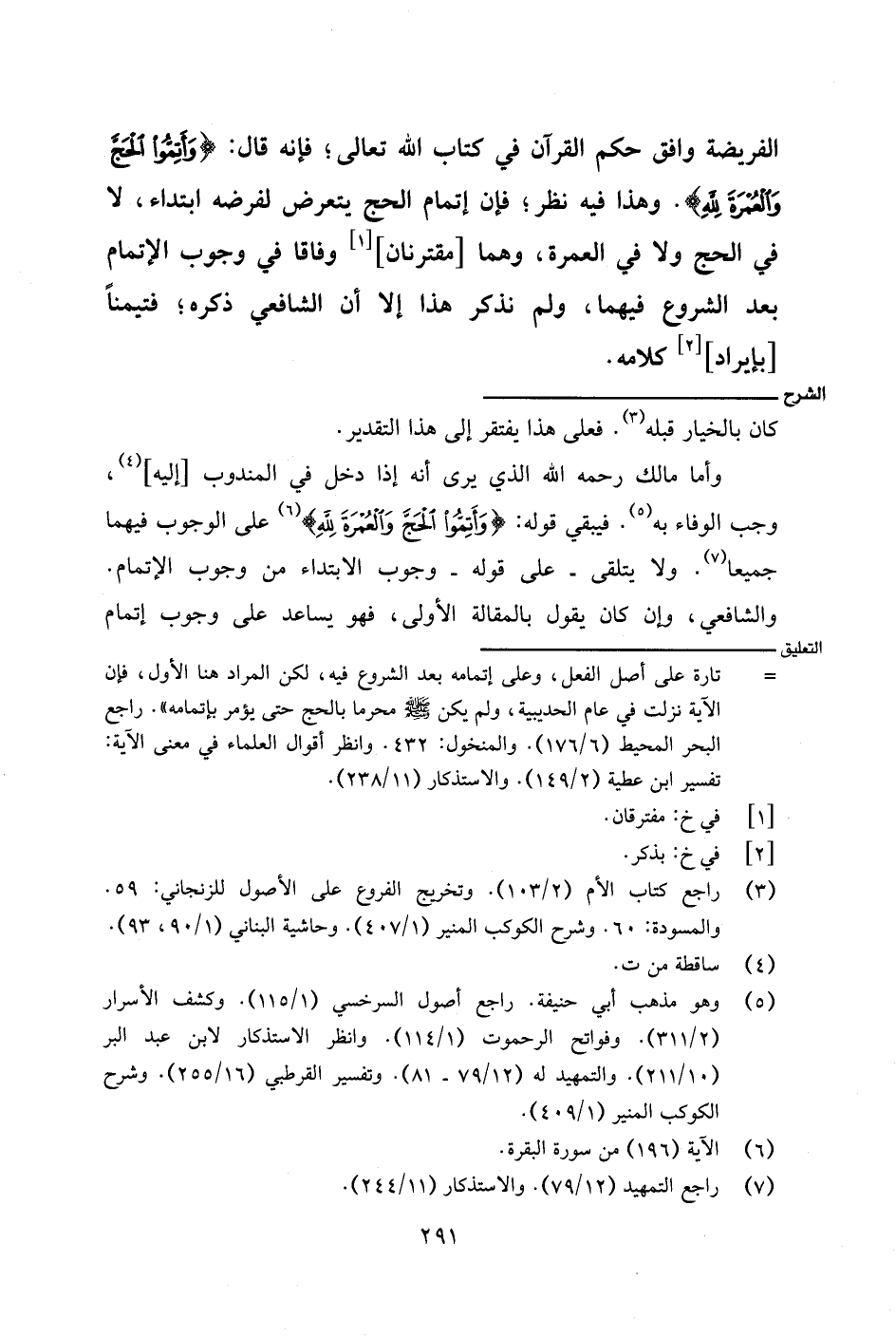 وأما مالك رحمه الله الذي يرى أنه إذا دخل في المندوب [إليه]، وجب الوفاء به. فيبقى قوله: {وأتموا الحج والعمرة لله} على الوجوب فيهما جميعًا. ولا يتلقى- على قوله- وجوب الابتداء من وجوب الإتمام. والشافعي، وإن كان يقول بالمقالة الأولى، فهو يساعد على وجوب إتمام