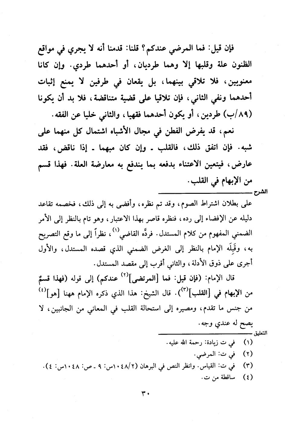 قال الإمام: (فإن قيل: فما [المرتضى] عندكم) إلى قوله (فهذا قسم من الإبهام في [القلب]). قال الشيخ: هذا الذي ذكره الإمام ها هنا [هو] من جنس ما تقدم، ومصيره إلى استحالة القلب في المعاني من الجانبين، لا يصح له عندي وجه.