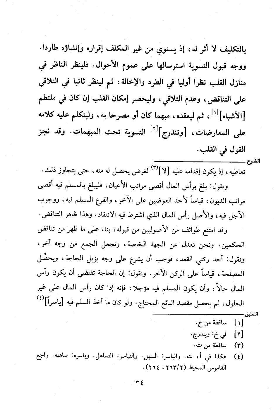 ويقول: بلغ برأس المال أقصى مراتب الأعيان، فليبلغ بالمسلم فيه أقصى مراتب الديون، قياسًا لأحد العوضين على الآخر، والفرع المسلم فيه، ووجوب الأجل فيه، والأصل رأس المال الذي اشترط فيه الانتقاد. وهذا ظاهر التناقض.
