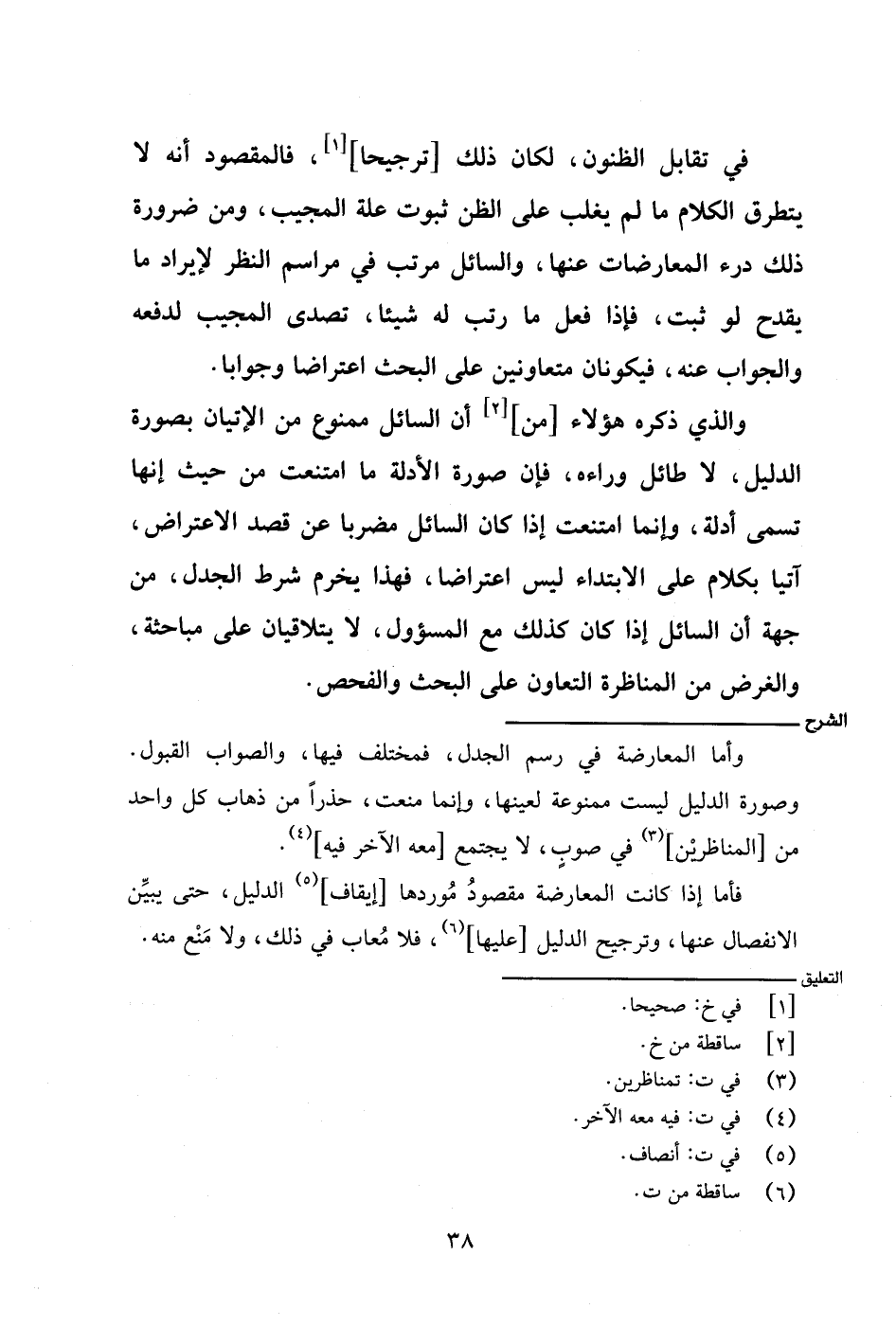 وأما المعارضة في رسم الجدل، فمختلف فيها، والصواب القبول. وصورة الدليل ليست ممنوعة لعينها، وإنما منعت، حذرًا من ذهاب كل واحد من [المناظرين] في صوب، لا يجتمع [معه الآخر فيه].
